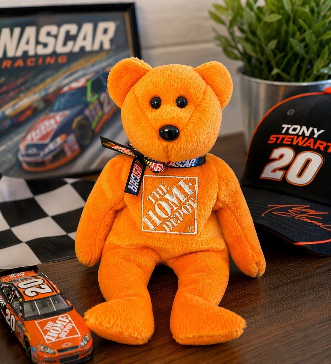 Bright orange TY Beanie Baby featuring NASCAR driver Tony Stewart #20 with The Home Depot branding on the front and Stewart 20 with signature detail on the back. Includes original TY tag and NASCAR ribbon around the neck. A great collectible for racing fans or Beanie Baby collectors.