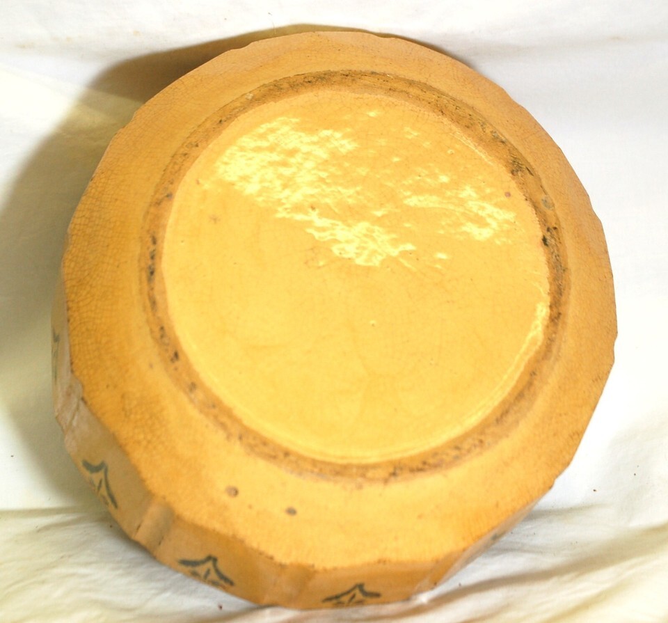 Antique Primitive Stoneware Mixing Bowl Yellow Green Flowers a