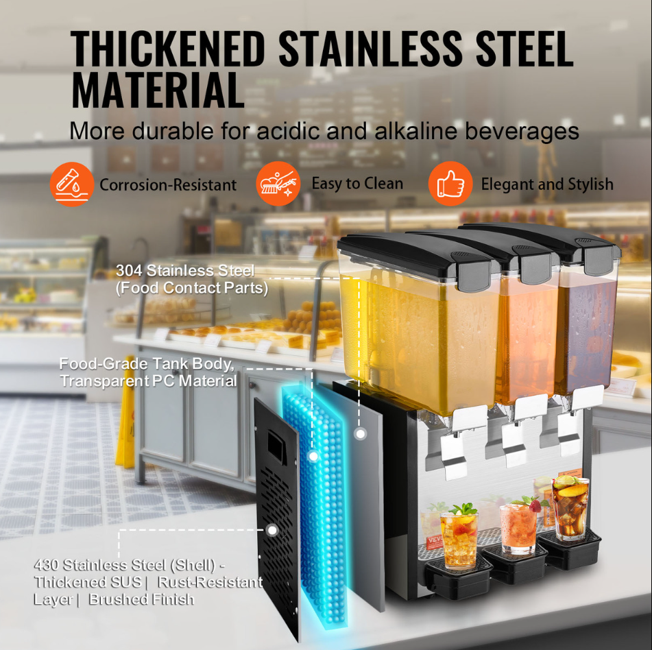 Large Capacity: This commercial beverage dispenser features a 10L tank capacity, accommodating a large volume of beverages. It provides a reliable cold beverage experience and easily handles customer traffic. Equipped with a rubber sealing ring to prevent beverage leakage.