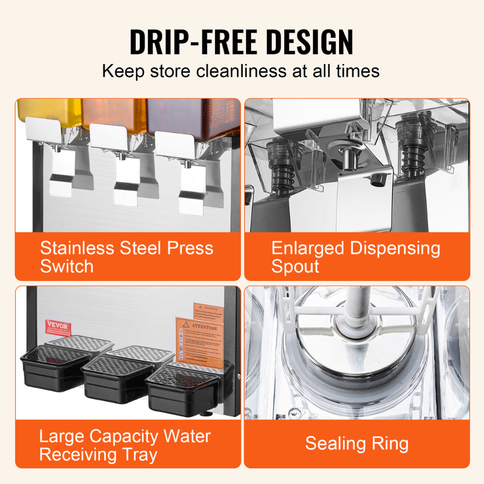 User-Friendly Design: Features a stainless steel press switch for convenient juice dispensing and an enlarged dispensing spout for uninterrupted drinking. It can be operated with one hand. The bottom has a large capacity water receiving tray to prevent beverage dripping, eliminating the need for frequent water pouring. Enhanced radiator and anti-slip base ensure safety.