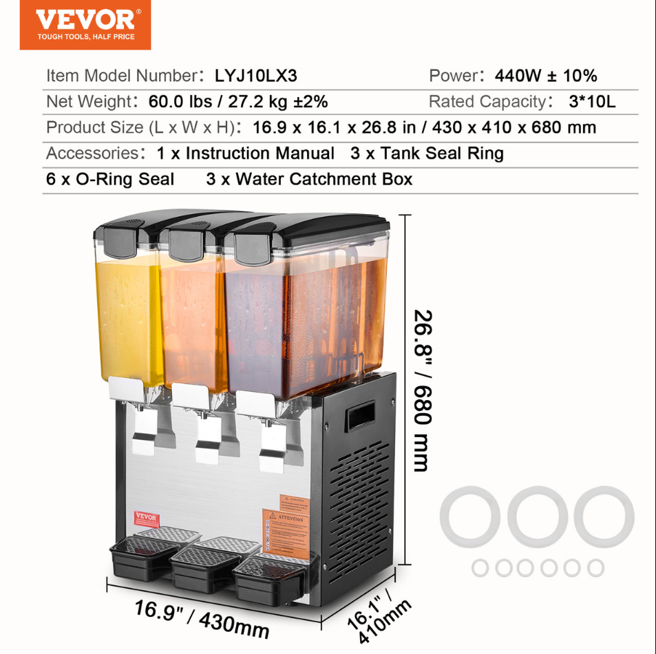 VEVOR Commercial Beverage Dispenser, 3 Tanks 10 L Per Tank Juice Dispenser
