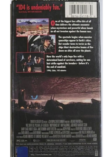 Join a group of ragtag heroes as they attempt to save Earth from the invading alien forces in the classic sci-fi film "Independence Day". Starring Will Smith, this movie follows the story of a group of unlikely allies as they go to the remote Nevada desert in order to attack the alien forces. Two days after the aliens arrive, the group strikes back on July 4th. Directed by Roland Emmerich and released in 1996, this 145-minute film is rated PG-13 for mild violence and destruction. Distributed by 20th Century Fox, the "Independence Day" VHS is a classic must-see for everyone.