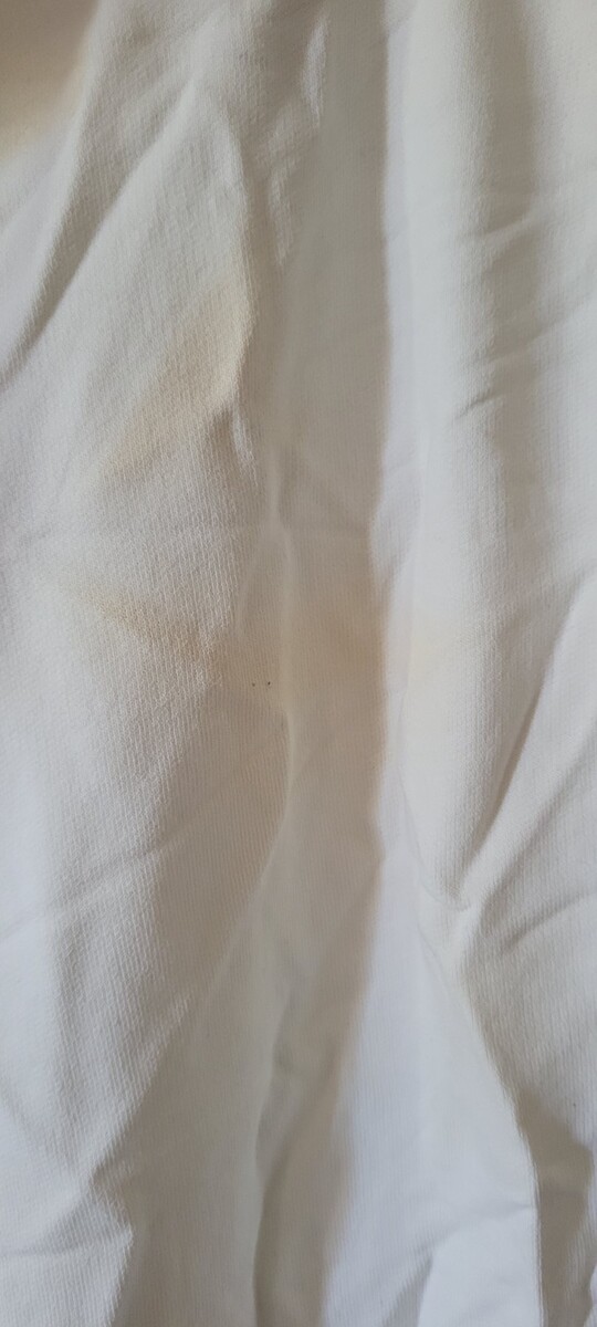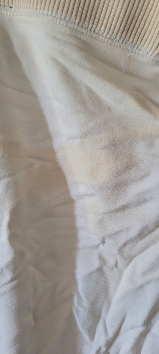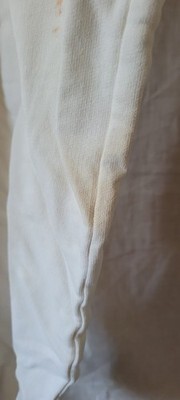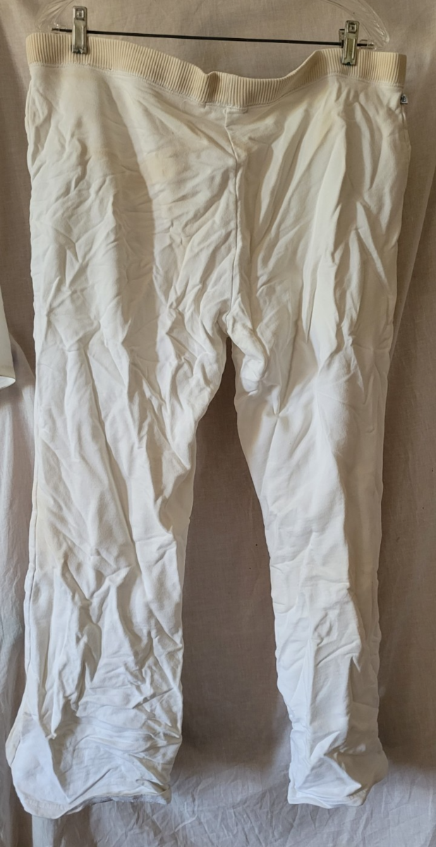 These pants are in good/fair used condition. As seen in the photos, there are spots on them. It could be cleaned with a more aggressive cleaning. We don't do aggressive cleaning due to people having sensitive skin and allergies. The elastic is shot. The drawstring works well. The size is XL. Measurements are approximately: Length: 42 inches. Inseam: 31 inches. Rise: 11 inches.