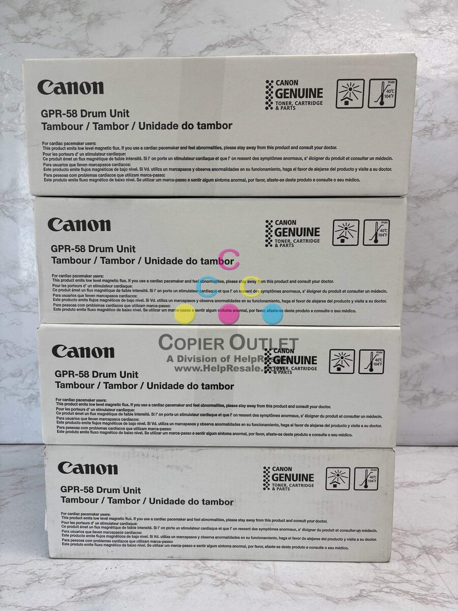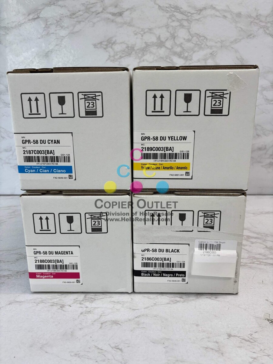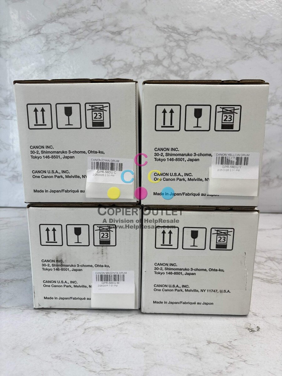 Lot Of 3 Genuine Canon GPR-58 DU CMY Drum Unit Cyan GPR-58 DU 2187C003 x1 Magenta GPR-58 DU 2188C003 x1 Yellow GPR-58 DU 2189C003 x1 New For imageRUNNER ADVANCE C256iF II,C256iF IIIC356iF II, C356iF III imageRUNNER ADVANCE DX C257iF, C259iF,C357iFC359iF Listed By: Renee (Sales Team) Positive Moments ?Happiness starts with this very second.? Did You Know? Did you know Toy Story was the first fully computer-animated feature film? Copier Outlet (A Division of Help Resale) Copier Outlet was established in 1993. We buy and sell both domestically and internationally and have wide assortment of copiers, consumable and accessories of all popular brands. All of our copiers are in house and available for your inspection. They all have been tested and rated for functions, cosmetics and overall appearance. Our consumable and accessories selections include toners, imaging units, developers and copier parts such as fax board, fixing unit, fuser unit, roller, cleaning brush, drum blades and etc. For more detailed information on our copiers, consumables and accessories, please feel free to give us a call. We are more than happy to assist you with the pricing and guide you to find the copiers, consumable and accessories you wish to buy. Best Regards, Copier Outlet Sales Team Monday - Friday: 9:00 am to 5:00 pm (PST) Copier Outlet Promo Video - YouTube Video will open in a new windowUsing the App? Paste link into a browser window: [isdntekvideo] All product and company names are trademarks TM or registered trademarks of their respective holders. Use of them does not imply any affiliation with or endorsement by them.