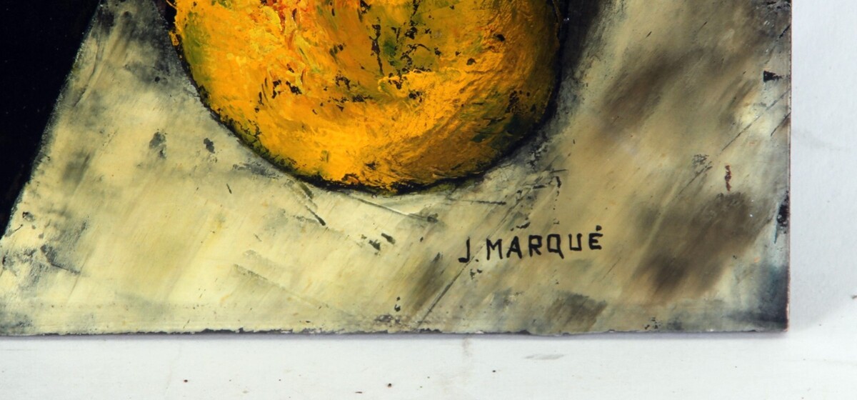 "Fruit sur la table" (1962) de J. Marque, peinture a l'huile sur carton, 12x24