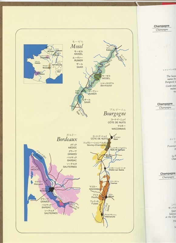 A beautifully full color illustrated Wine List in Japanese, French and English. 8 Pages held in to a gold on faux wood cover with a white cord. Has maps of the wine regions, a color label and description of each wine and a laid in single page Beaujolais Nouveau Festival 1988 flyer. Japan Airlines Illustrated Wine List JAL 1980's Beaujolais Nouveau Festival . Measures about 7" x 11 3/4" when closed.