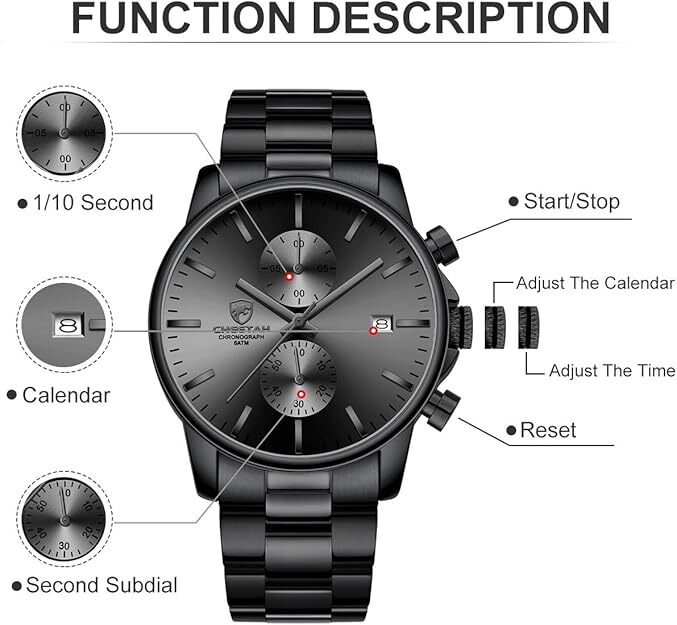 ?Sports chronograph: Multifunctional sub-dial can work, chronograph, calendar, run seconds. Provide you with multi-function purpose use.