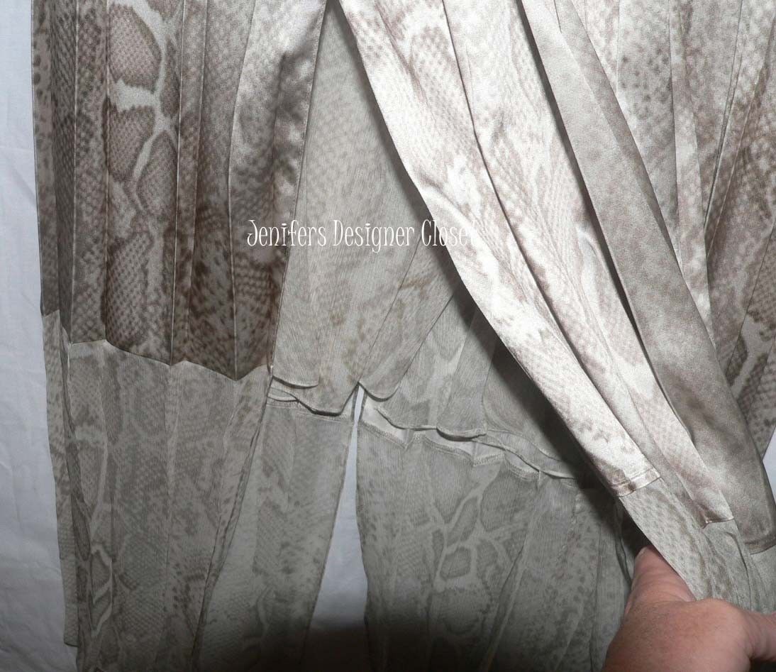 97% SILK and 3% elastane for stretch. Elegant skirt that is a reptile snake print. It is a pleated maxi skirt that is a satiny, silk at the top, and semi-sheer at the bottom. It has slits on front back sides so this is gorgeous when you walk.