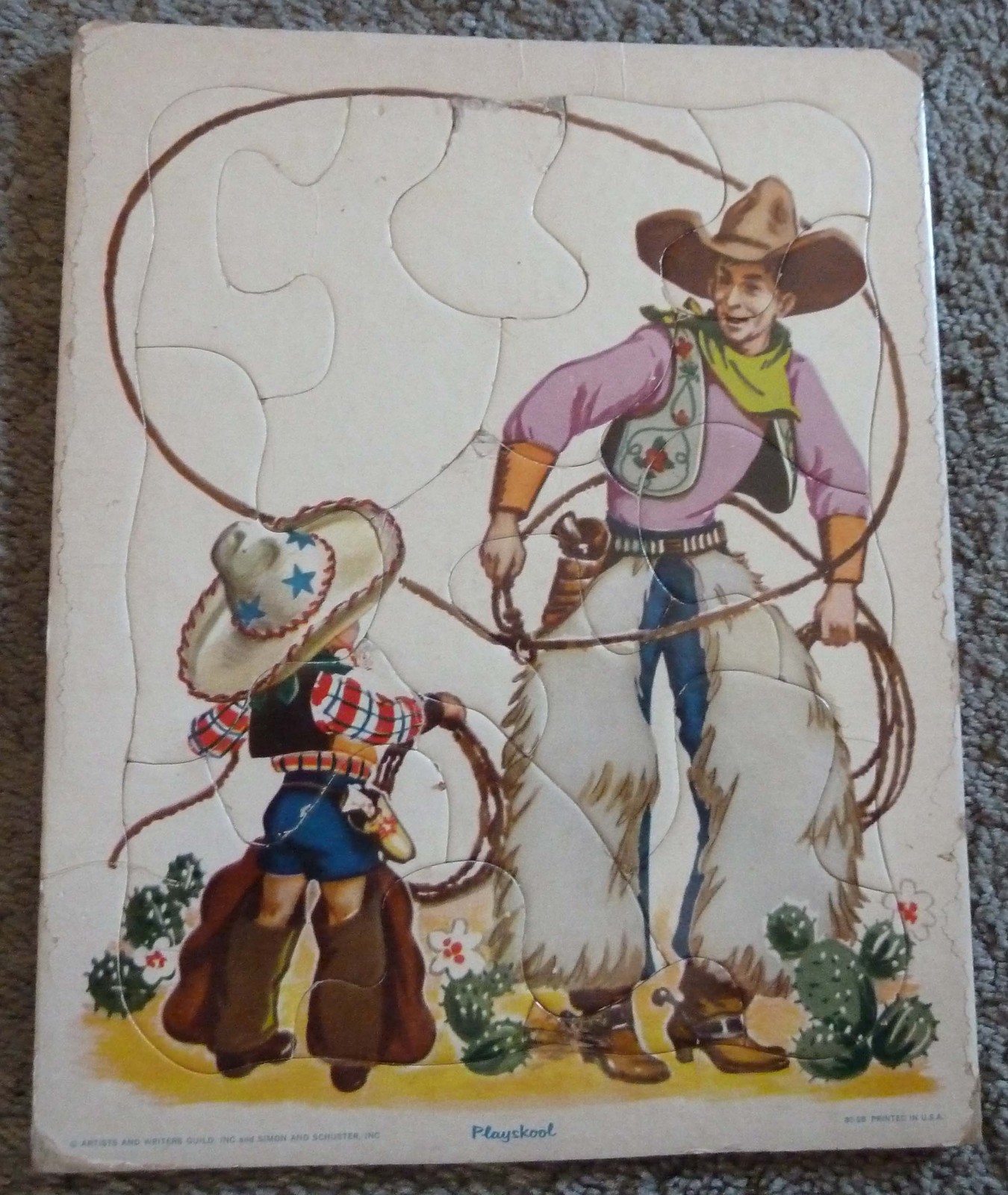 Vintage Playskool COWBOY Frame Tray Puzzle. Says Artist and Writers Guild Inc. and Simon and Schuster, Inc. 80-5B" This is a cardboard frame tray puzzles. Measures around 8 x 11".