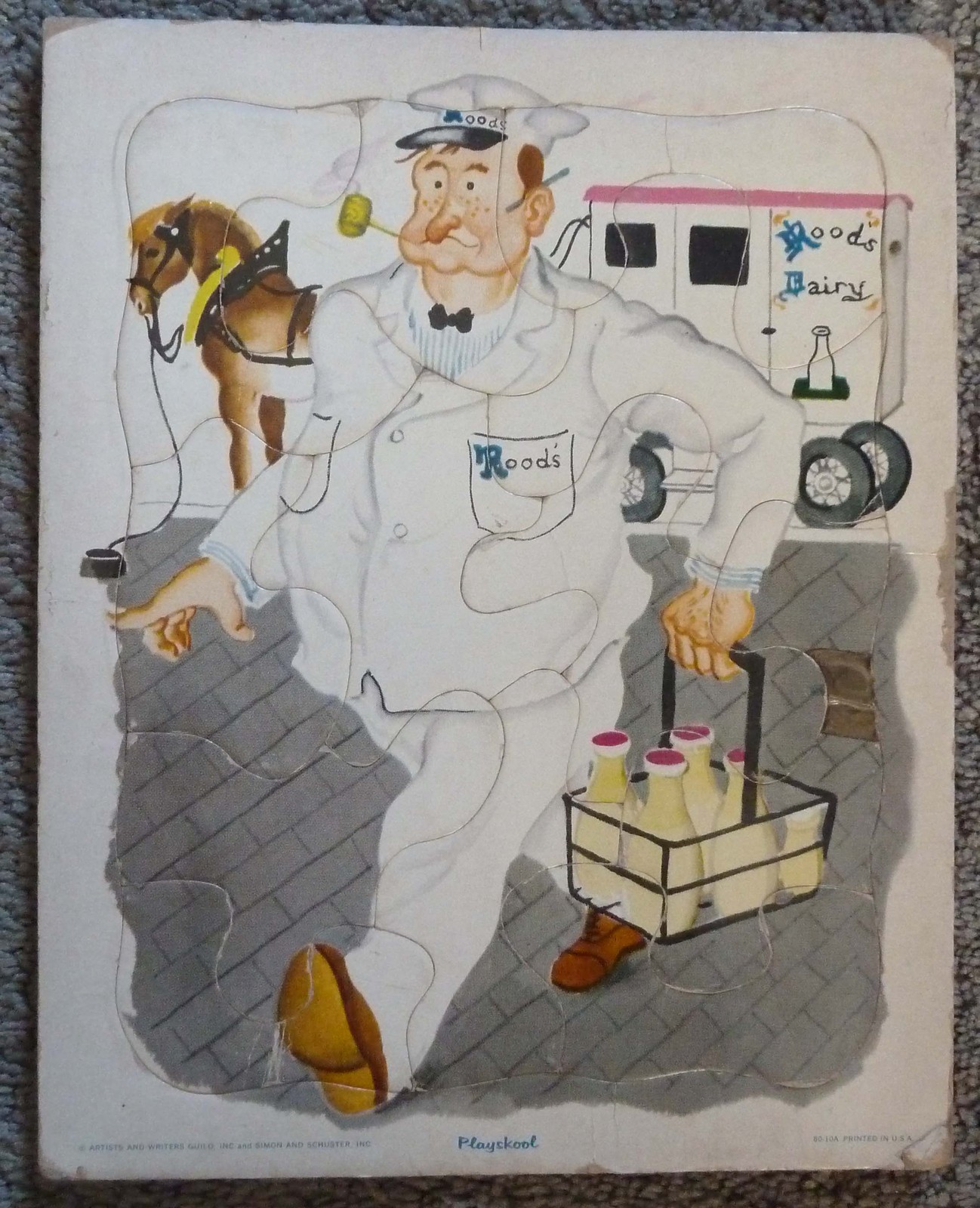Vintage Playskool "Rood's Dairy" MILK MAN Frame Tray Puzzle. Says Artist and Writers Guild Inc. and Simon and Schuster, Inc. 80-10A" This is a cardboard frame tray puzzles. Measures around 8 x 11".