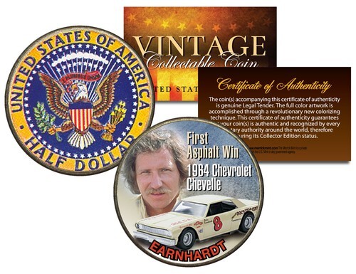 Here is your opportunity to own or to gift the ?DALE EARNHARDT - #3 NASCAR? colorized 1951 Franklin Silver Half Dollar U.S. Coin, which has been enhanced with a beautifully colorized image by the Merrick Mint. This 1951 coin marks Dale Earnhardt?s birth year. Each coin comes in a premium coin capsule with a full color Certificate of Authenticity. This Legal Tender United States coin has been colorized with an application of special inks directly to the surface of the coin, using a unique and painstakingly multicolor coin process, which achieves a level of detail, color saturation, and durability that is #1 in the coin industry. The result is an everlasting colorized coin collectible of ultra-high quality. Each coin features the right portrait of Benjamin Franklin design on the obverse and a Liberty Bell design on the reverse. The 1951 Franklin Silver half dollar is a U.S. fifty cent coin with mint marks chosen at random.