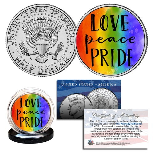 This LANDMARK SUPREME COURT RULING colorized 2015 JFK Half Dollar U.S. coin is a historic keepsake collectible, which celebrates the June 26, 2015 Supreme Court ruling legalizing same-sex marriage nationwide. Each coin comes in a premium coin capsule with a Certificate of Authenticity to guarantee that your coin is authentic and recognized by every monetary authority around the world, assuring its Collector Edition status. This Legal Tender United States coin has been colorized with an application of special inks directly to the surface of the coin by The Merrick Mint, using a unique and painstakingly multicolor coin process, which achieves a level of detail, color saturation, and durability that is #1 in the coin industry. The result is an everlasting colorized coin collectible of ultra-high quality.