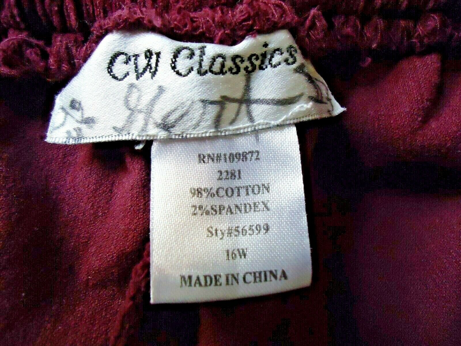 Here is a pair of Womens CW Classics Size 16 W Maroon Corduroy Type Of Pants " BEAUTIFUL PAIR ".The pics do not do this item(s) justice.If you have any concerns or questions about this item(s) please ask before bidding / purchasing this item(s).Thank You.-(CL20)