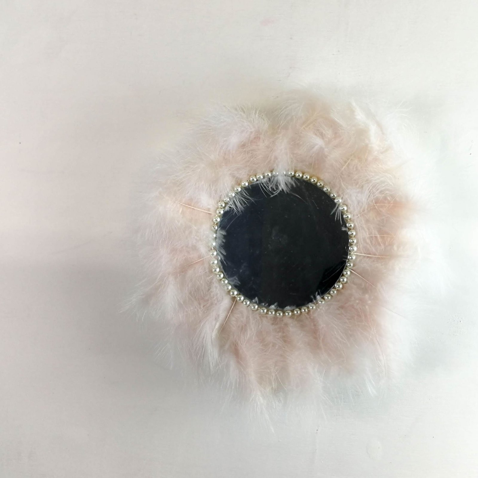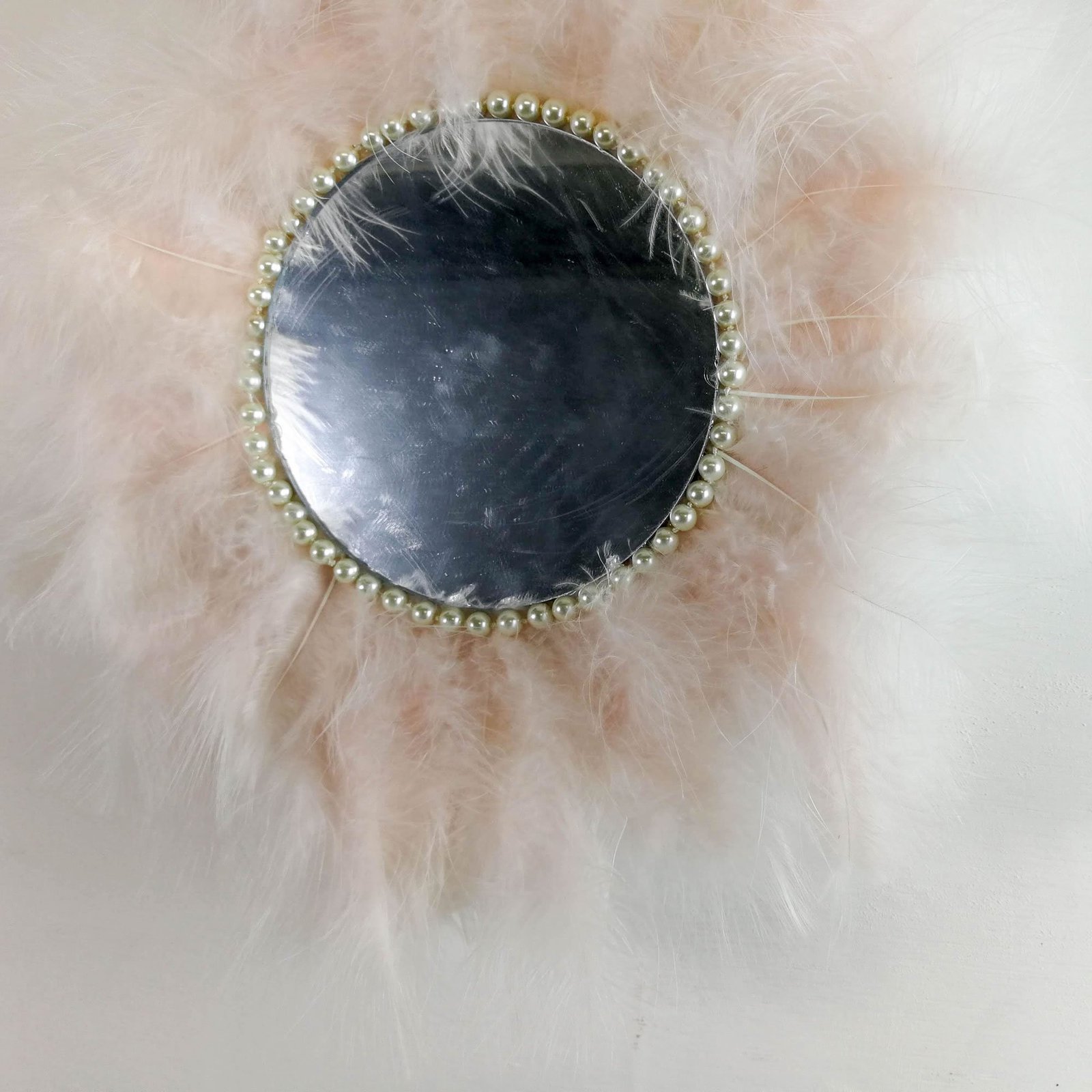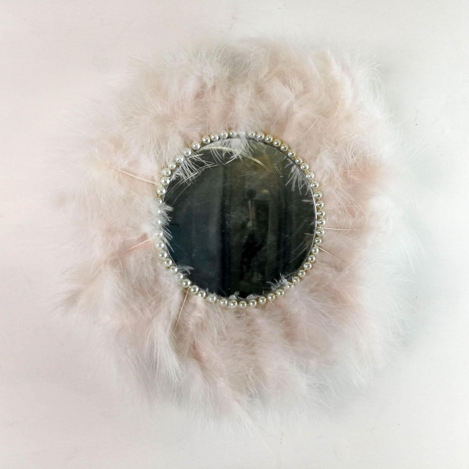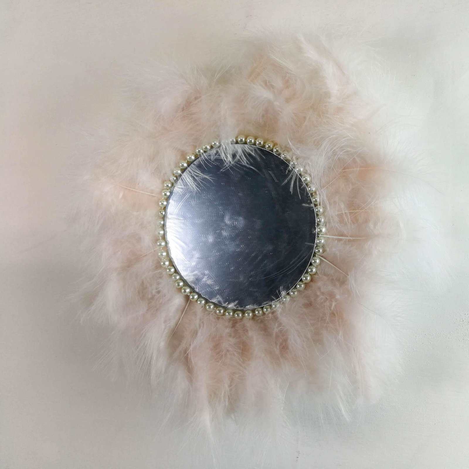 Beautiful handmade mirror covered around with soft feathers gives a true Juju African theme to the decor.