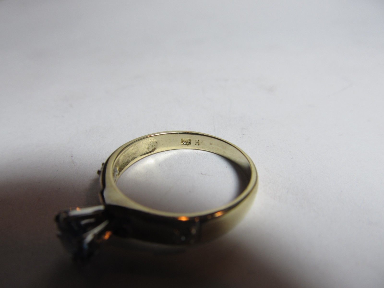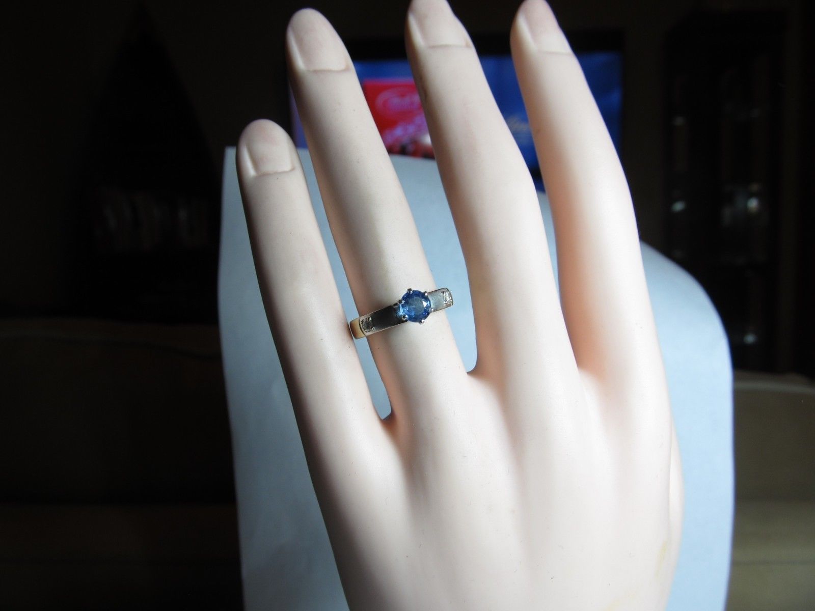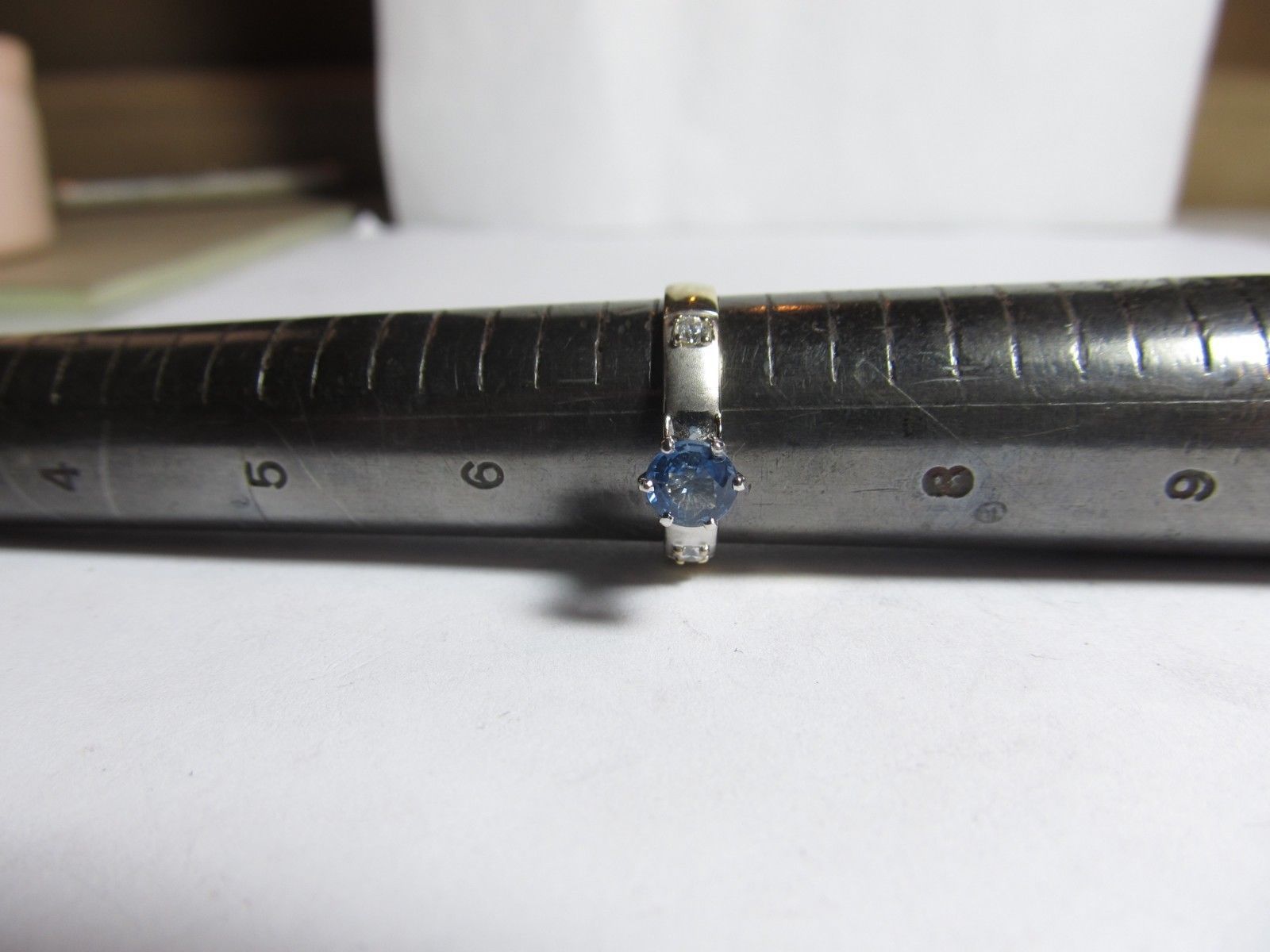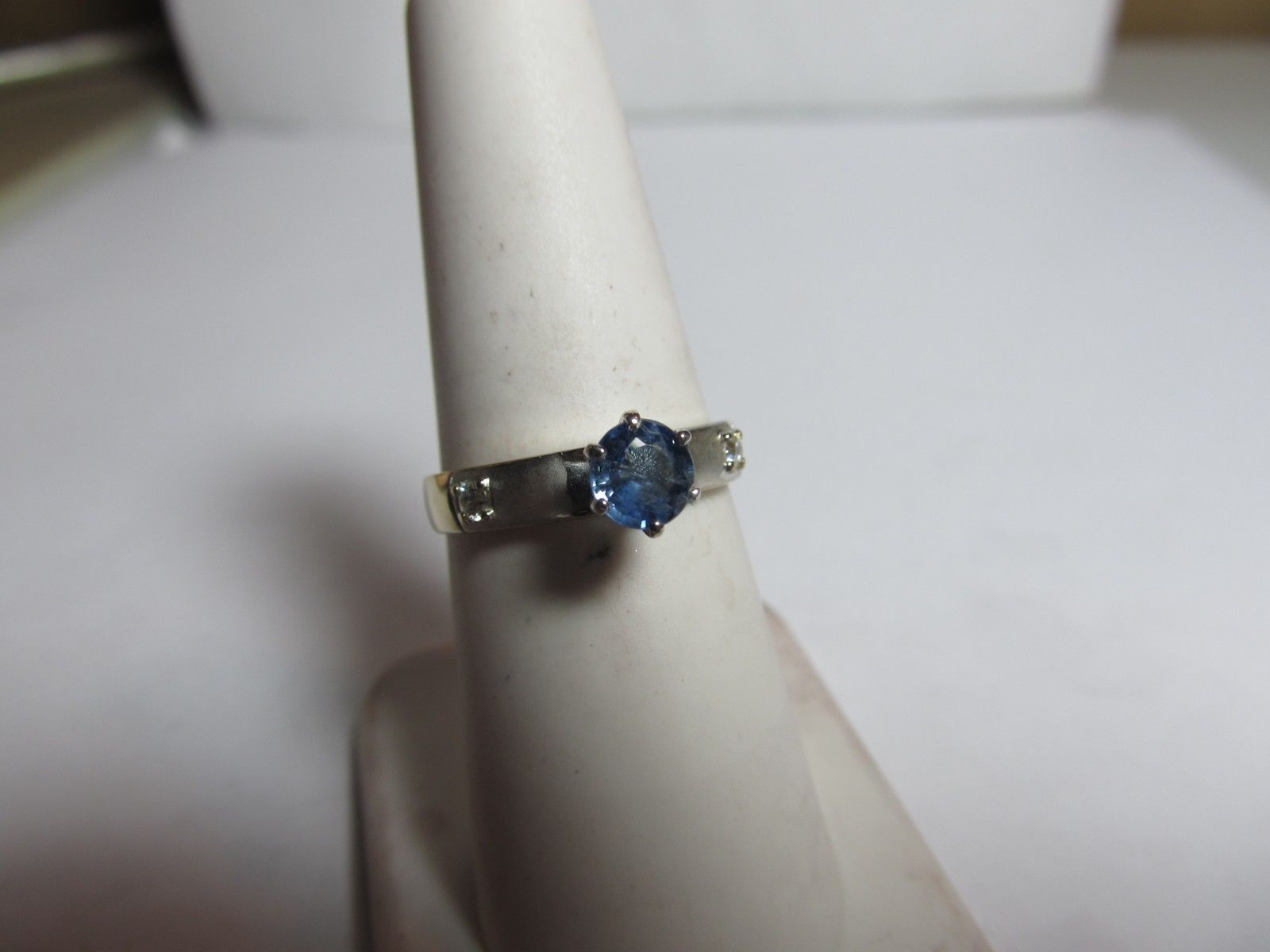 THIS LOVELY RING IS MARKED 14K AND IS WHITE GOLD. IT WEIGHS 2.9 GRAMS. HEAD SET AT THE TOP IS A ROUND FACETED NICE BLUE NATURAL SAPPHIRE WITH AN APPROX WEIGHT OF .65 CTS. SET ON EACH SIDE OF THE RING IS A FULL CUT ROUND CLEAN AND WHITE DIAMOND. THE 2 DIAMONDS HAVE AN APPROX TOTAL WEIGHT OF .06 CTS. THE RING WEARS TO A SIZE 7 AND CAN BE RESIZED.