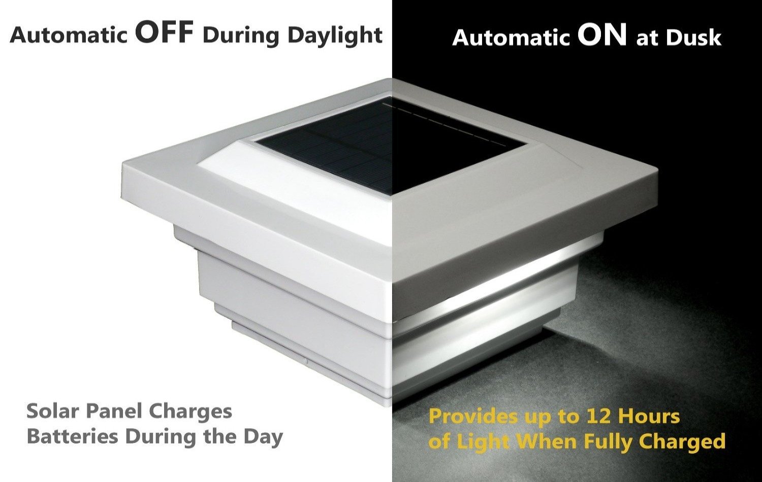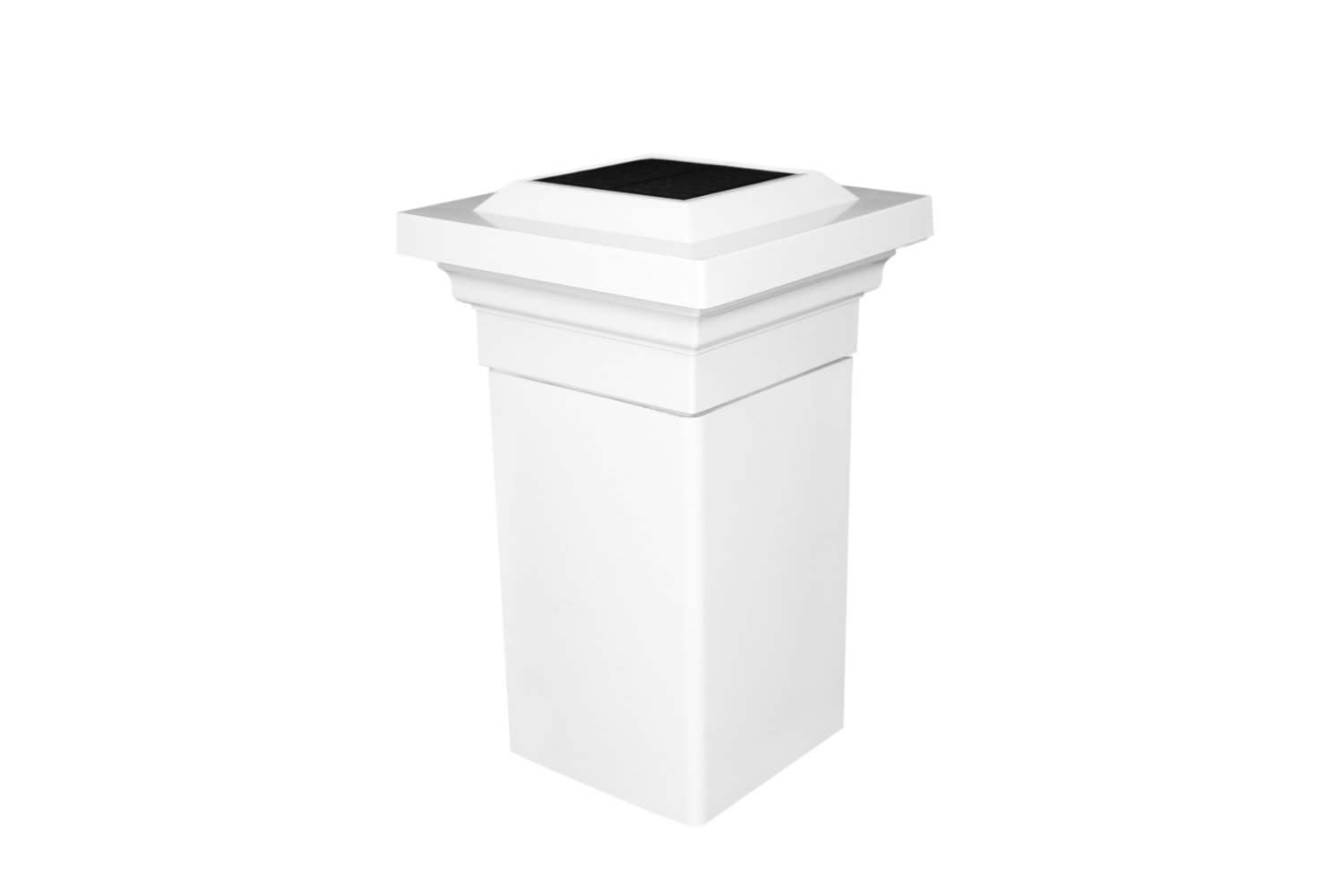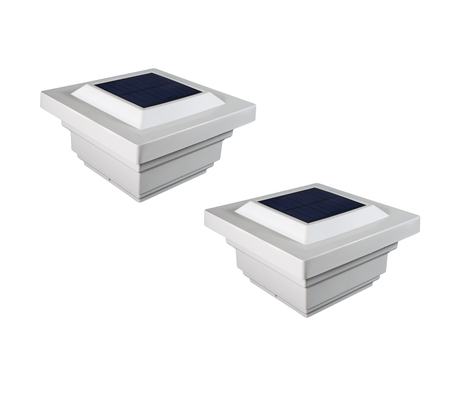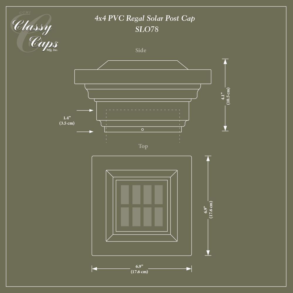 The attractive low profile design of the Classy Caps Regal Solar Post Cap will add beauty and elegance to your deck, fence or gardens. Four surface mount LED's cast a brilliant white light downward onto the post and surrounding area for up to 12 hours. The high quality, durable PVC construction will not fade, crack or yellow. Easily installs on an actual 4"x4" post with included mounting screws. Three times brighter than standard LED's.