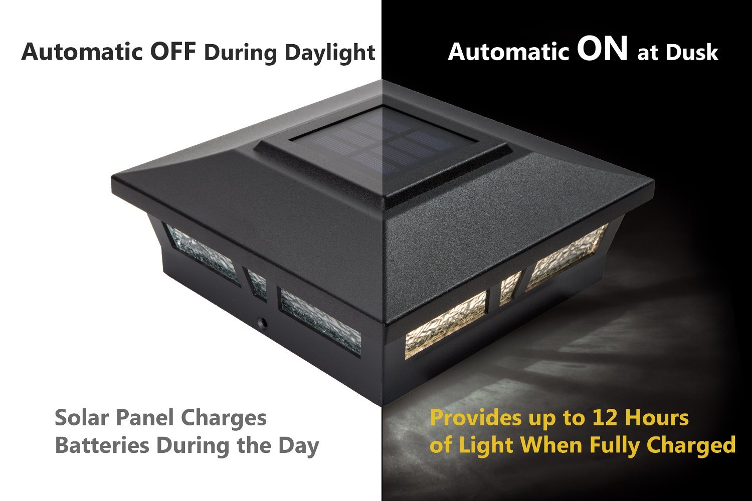 Similar in design to our low profile Cambridge solar post cap, the Oxford is manufactured from heavy duty, weather resistant cast aluminum with a durable powder coat satin finish that is offered in three colors. Featuring unique decorative glass lens and two surface mount LED's, the 6x6 Oxford Solar Post Cap will cast a warm natural light that will automatically light up at dusk creating a picturesque landscape for your fence, porch or deck. Another superior design by Classy Caps. Adaptor included to fit over 3 post sizes - an actual 6"x6", 5.5"x5.5" or 5"x5" post.