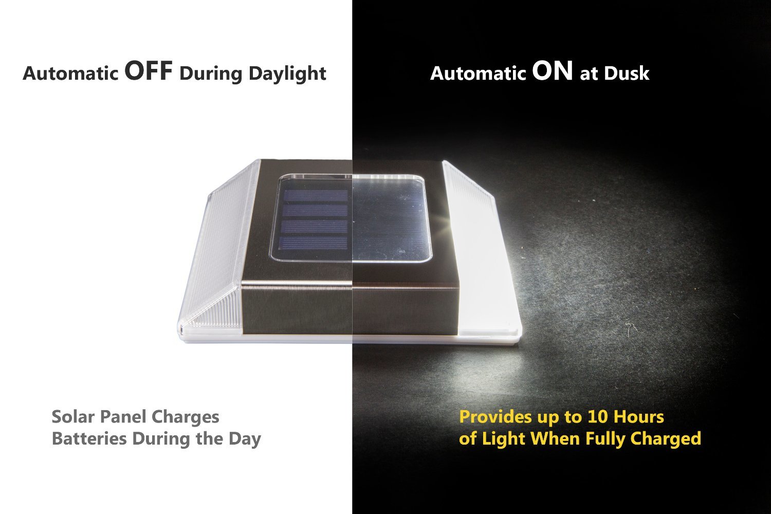 Add safety and beauty to your outdoor gardens, pathways, decks, docks, laneways and more. Dual powerful solar LED's cast a brilliant white light over a large radius for up to 10 hours per night. Our solar path lights are made with durable weather resistant stainless steel. These energy efficient lights are easy to install with included hardware for deck or lawn mounting.