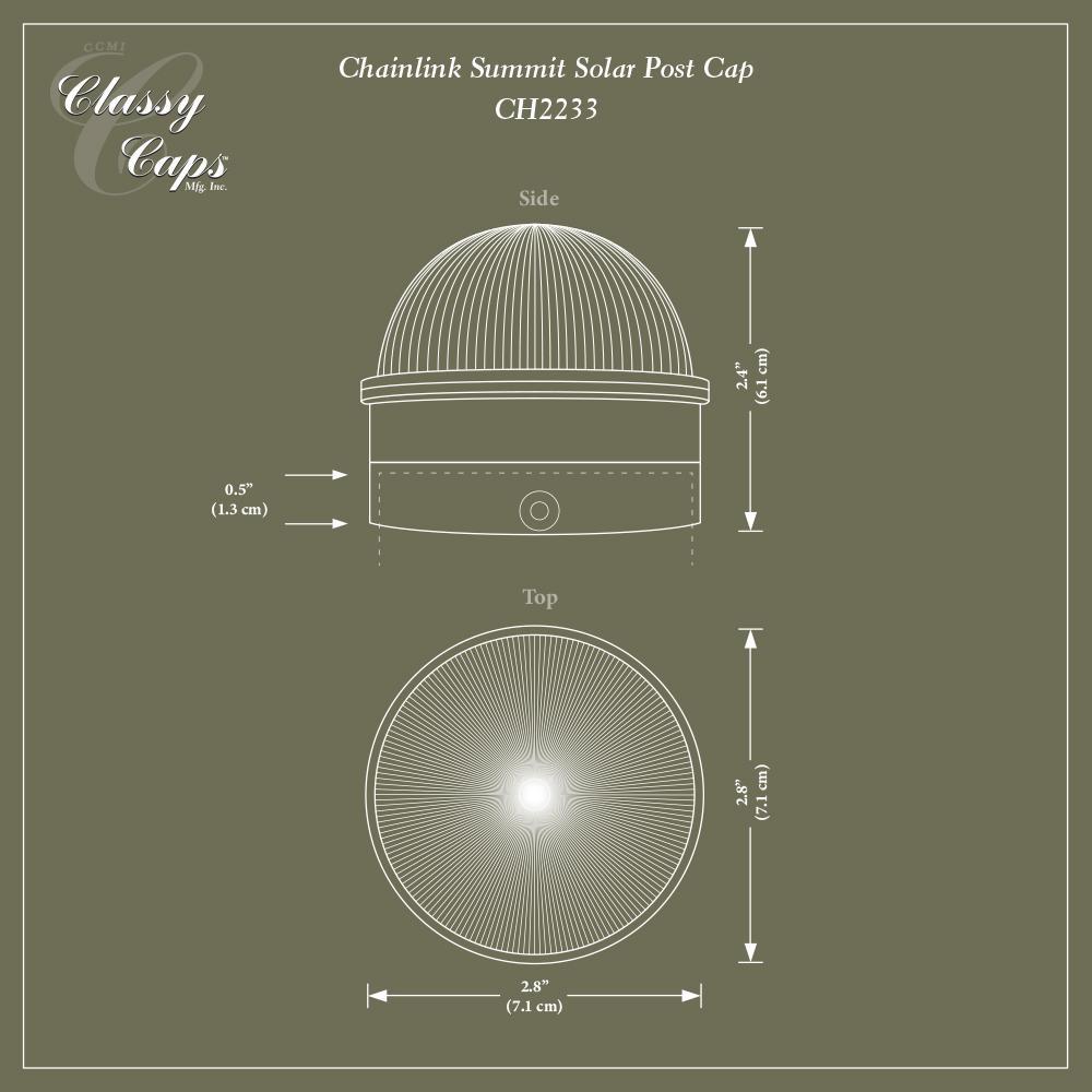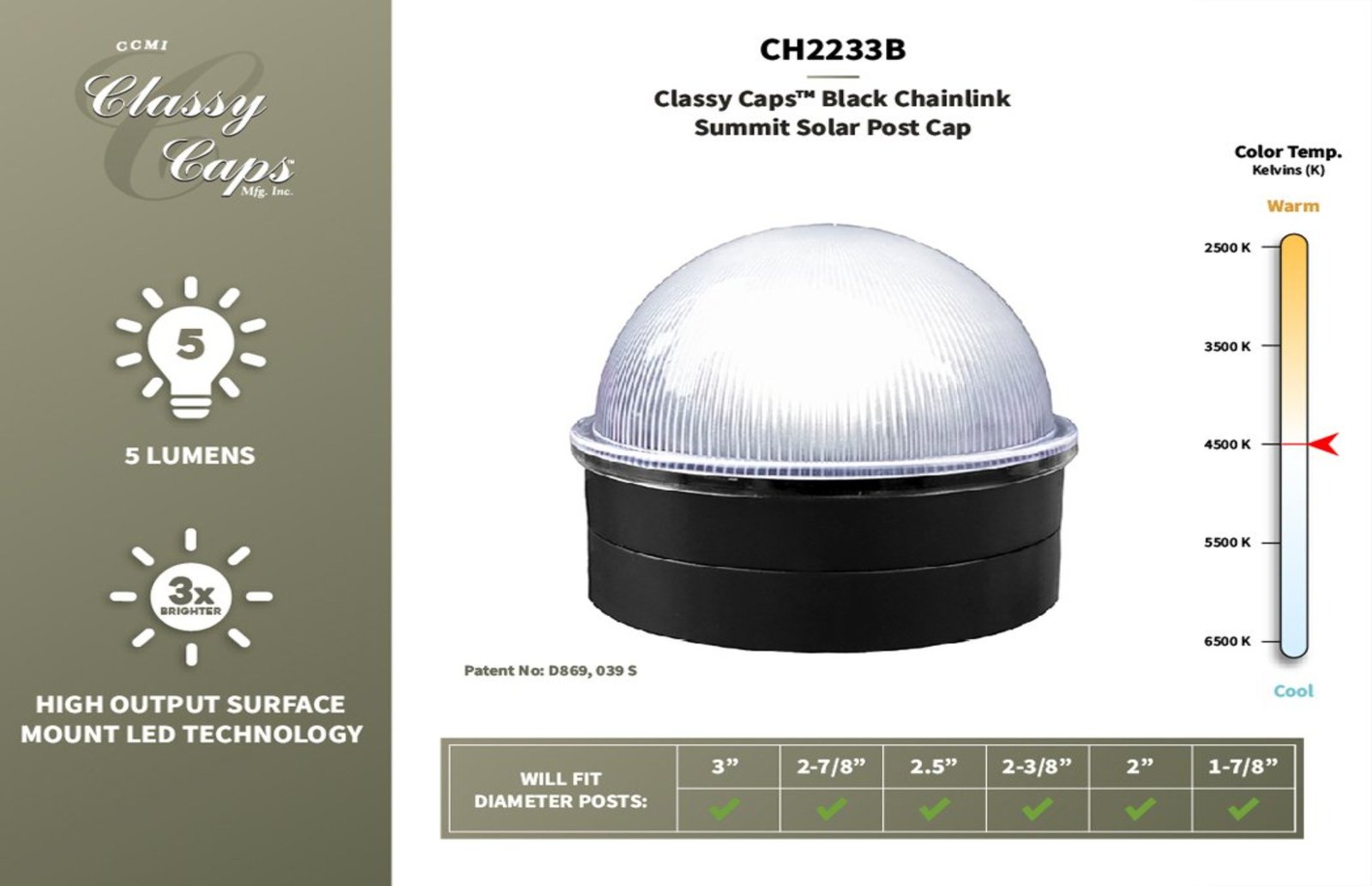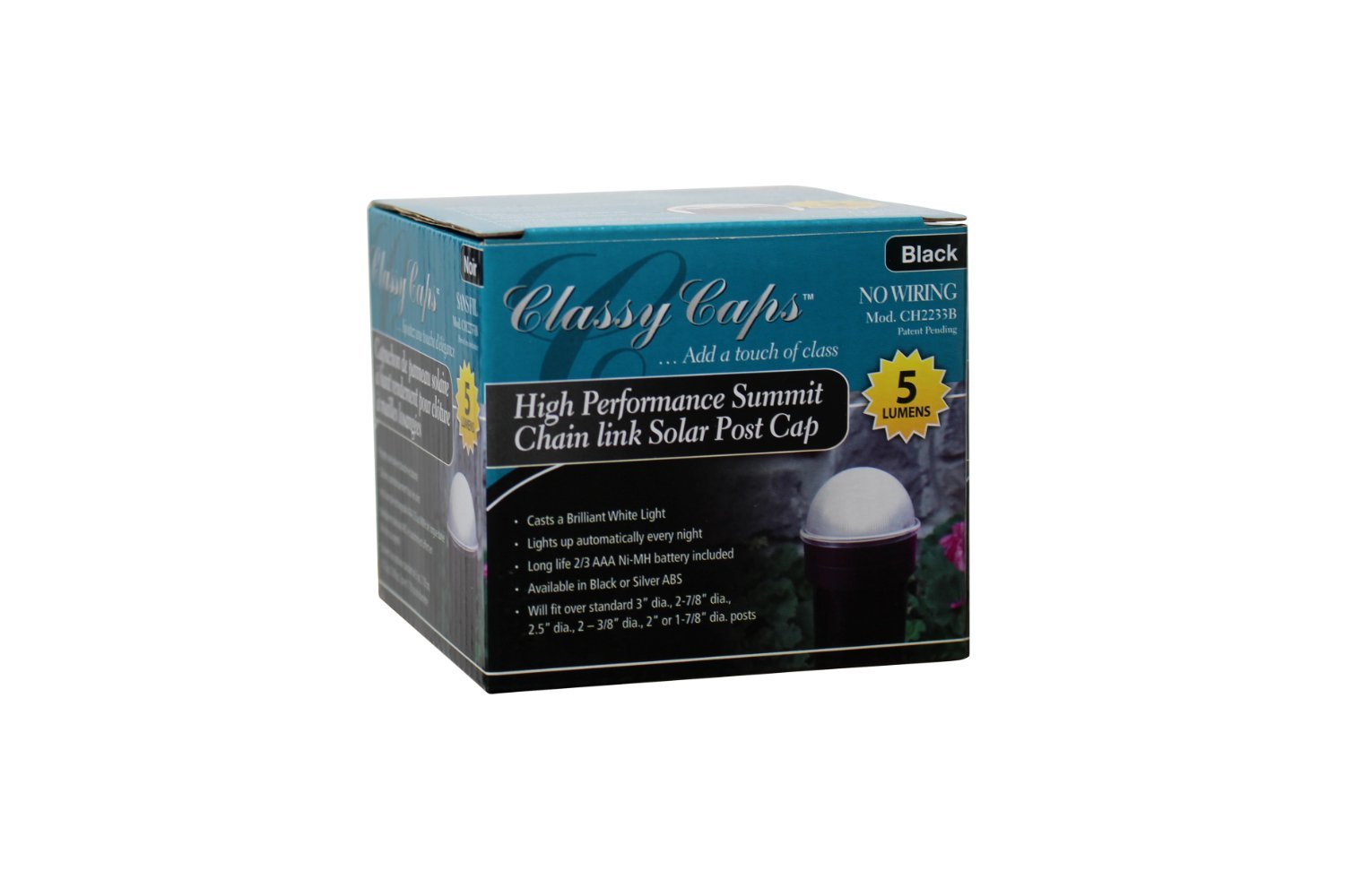 Add a touch of class to your chain link fence with our high performance Summit solar post cap. This one of a kind design by Classy Caps will compliment your existing chain link posts. Turns on automatically every night casting a brilliant white light onto the surrounding area. Manufactured to fit over six standard chain link fence posts - 3" dia., 2-7/8" dia., 2.5" dia., 2-3/8" dia., 2" or 1-7/8" dia.