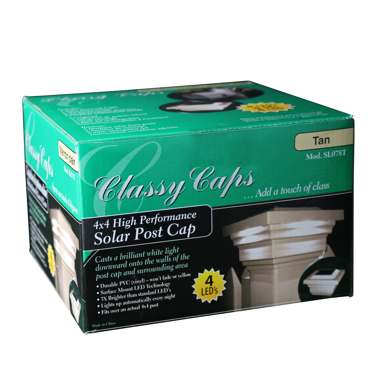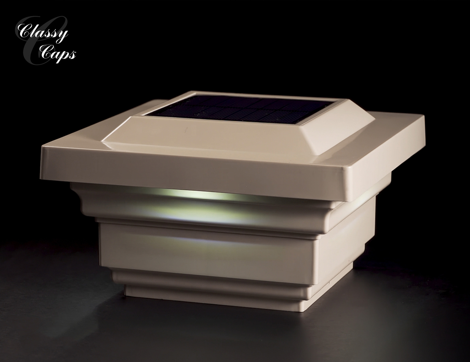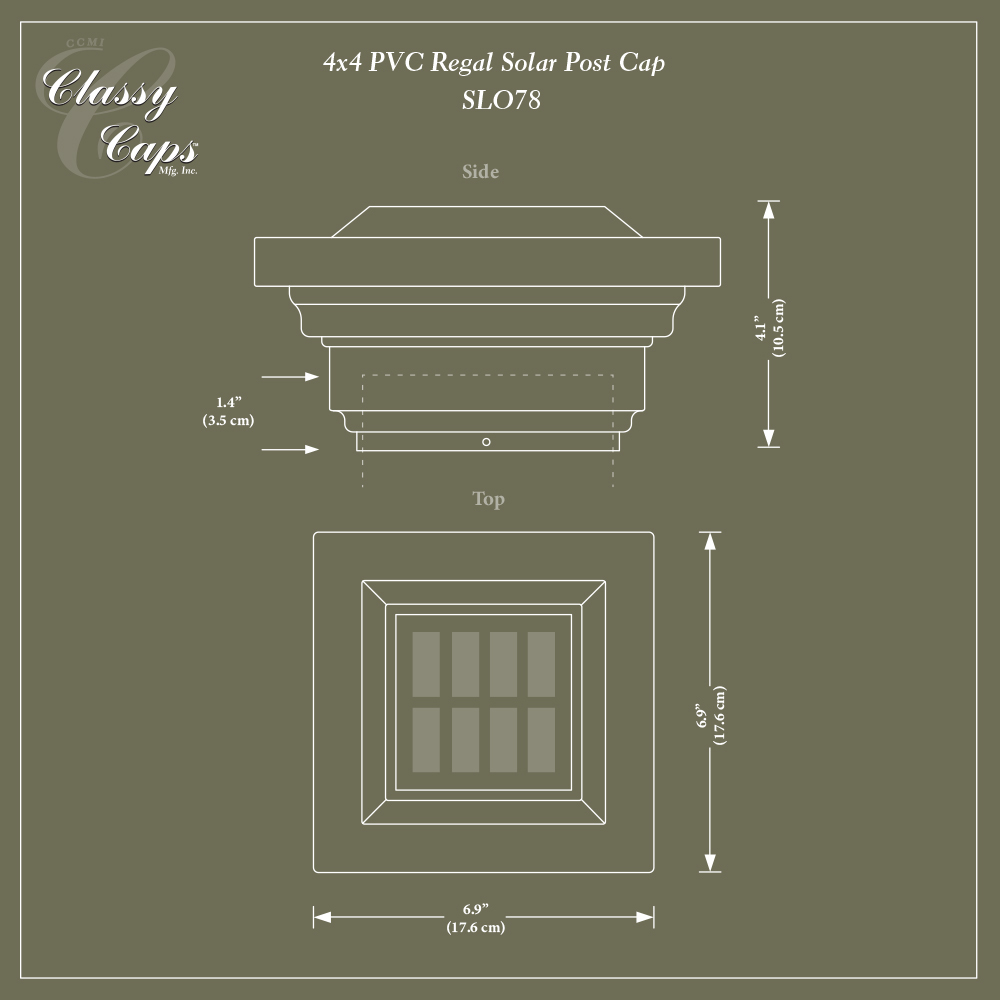 The attractive low profile design of the Classy Caps Majestic Solar Post Cap will add beauty and elegance to your deck, fence or gardens. Four surface mount LEDโs cast a brilliant white light downward onto the post and surrounding area for up to 12 hours. The high quality, durable PVC construction will not fade, crack or yellow. Easily installs on an actual 4โx4โ post with included mounting screws. Three times brighter than standard LEDโs.
