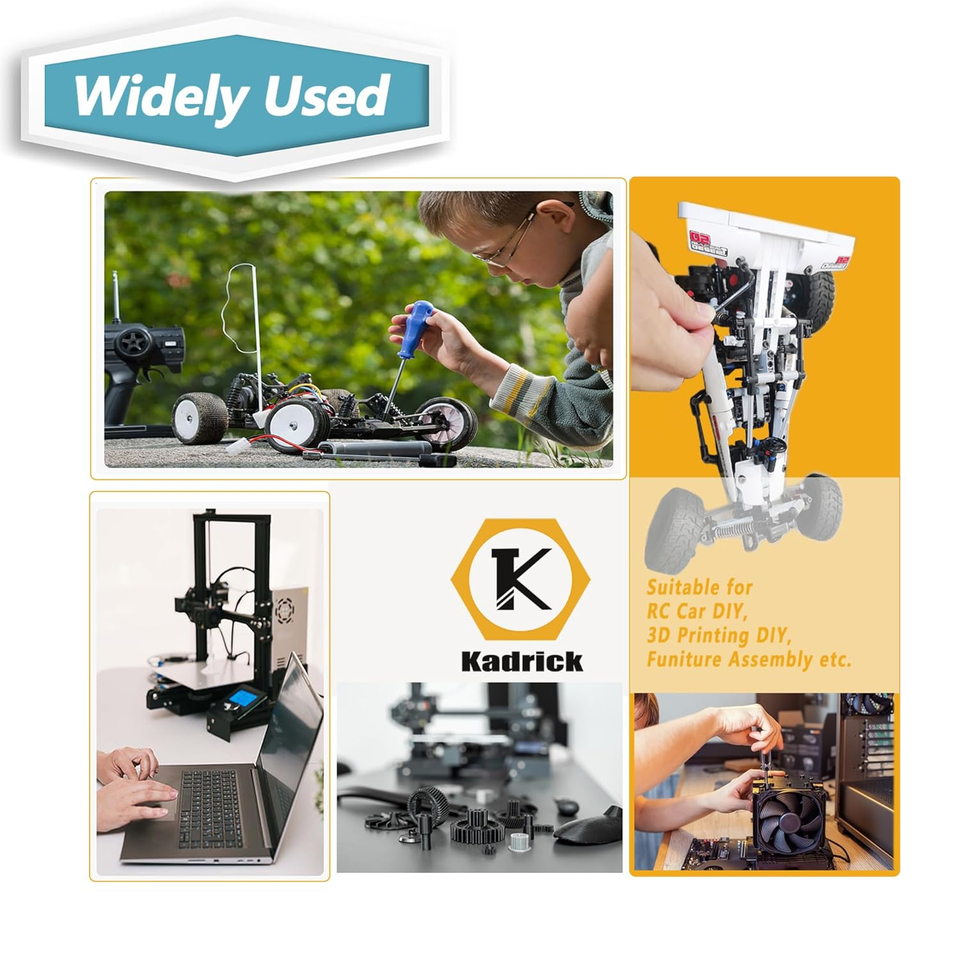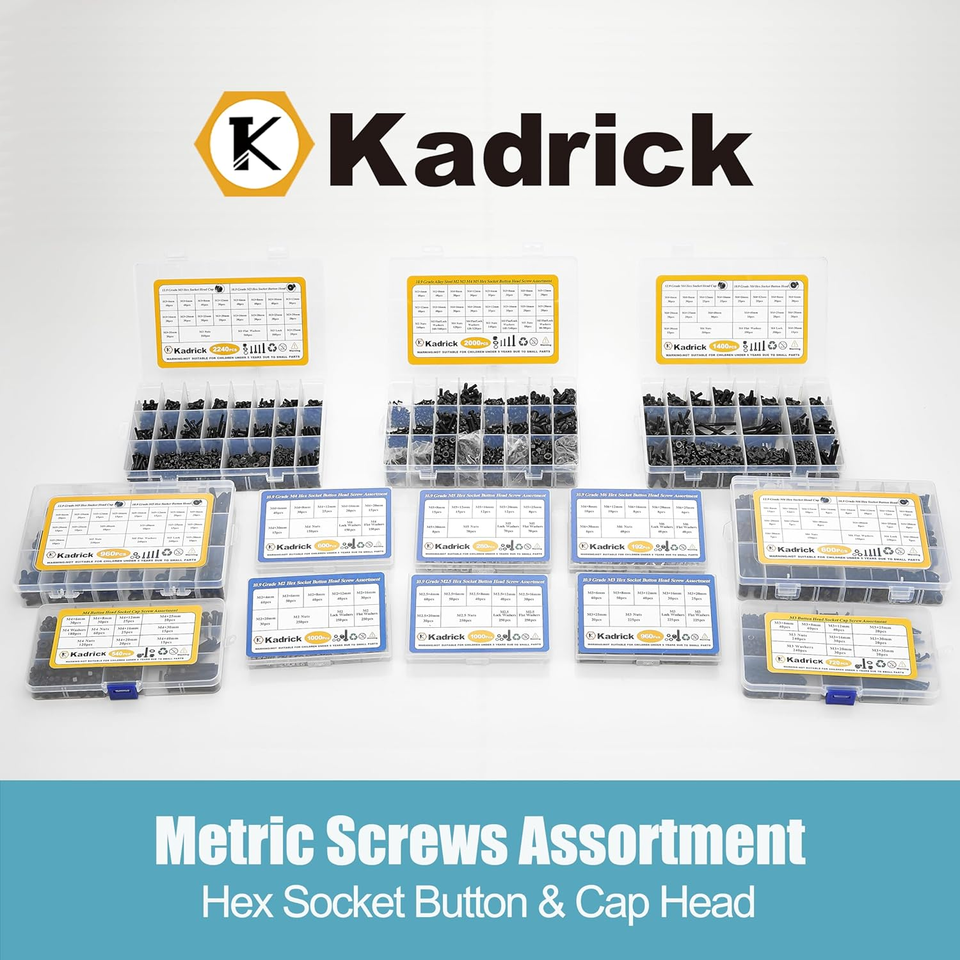 The Kadrick 1,400-Piece M4 Screws, Nuts Washers Assortment Kit is designed for precision, durability, and convenience. Featuring both button head and cap head hex socket screws in lengths from 6mm to 40mm, this set is made from 10.9 12.9 grade alloy steel for high strength and reliable performance. Perfect for 3D printing, electronics, robotics, furniture assembly, and general DIY projects.