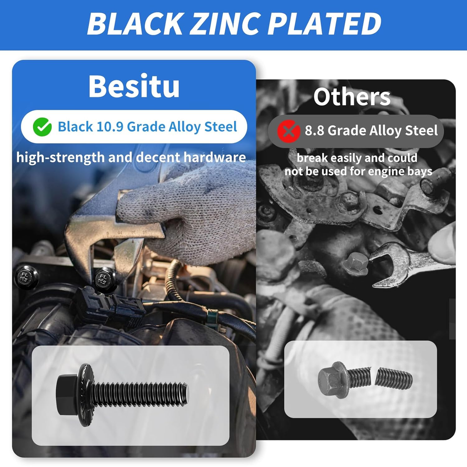 ?10.9 Alloy and Black Galvanized?This flange bolt kit is crafted from 10.9 grade alloy steel with a durable black galvanized finish. If you're working inside the engine, you'll need high-strength Class 10.9 bolts on hand. Class 8.8 bolts are not rated for high-torque conditions.