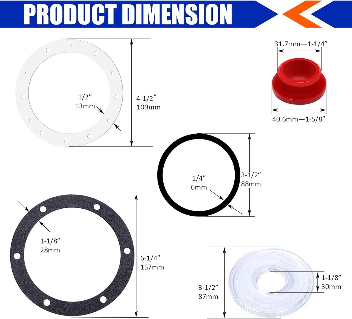 : Plastic window center hole I.D: 1-1/8'', plastic window O.D: 3-1/2'', rubber plug OD: 1-1/8'', white gasket hole pitch: 3-7/8" on center, hub cap gasket hole pitch: 5-1/2" on center. Please check the size information and compatibility carefully before placing orders