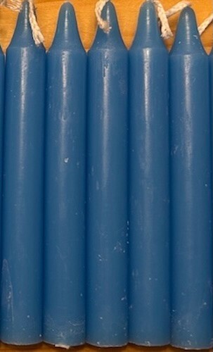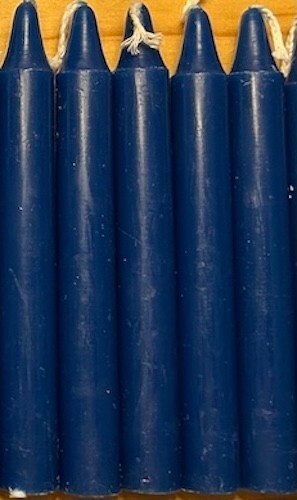 Blue chime candles for ritual, spell and altar use. Blue represents meditation and tranquility. Standing approximately 4 inches tall and 1/2 inch in diameter, each candle provides an average of 2 - 2.5 hours of illumination. 5 candles in a bundle. Tints can vary per dye lot.