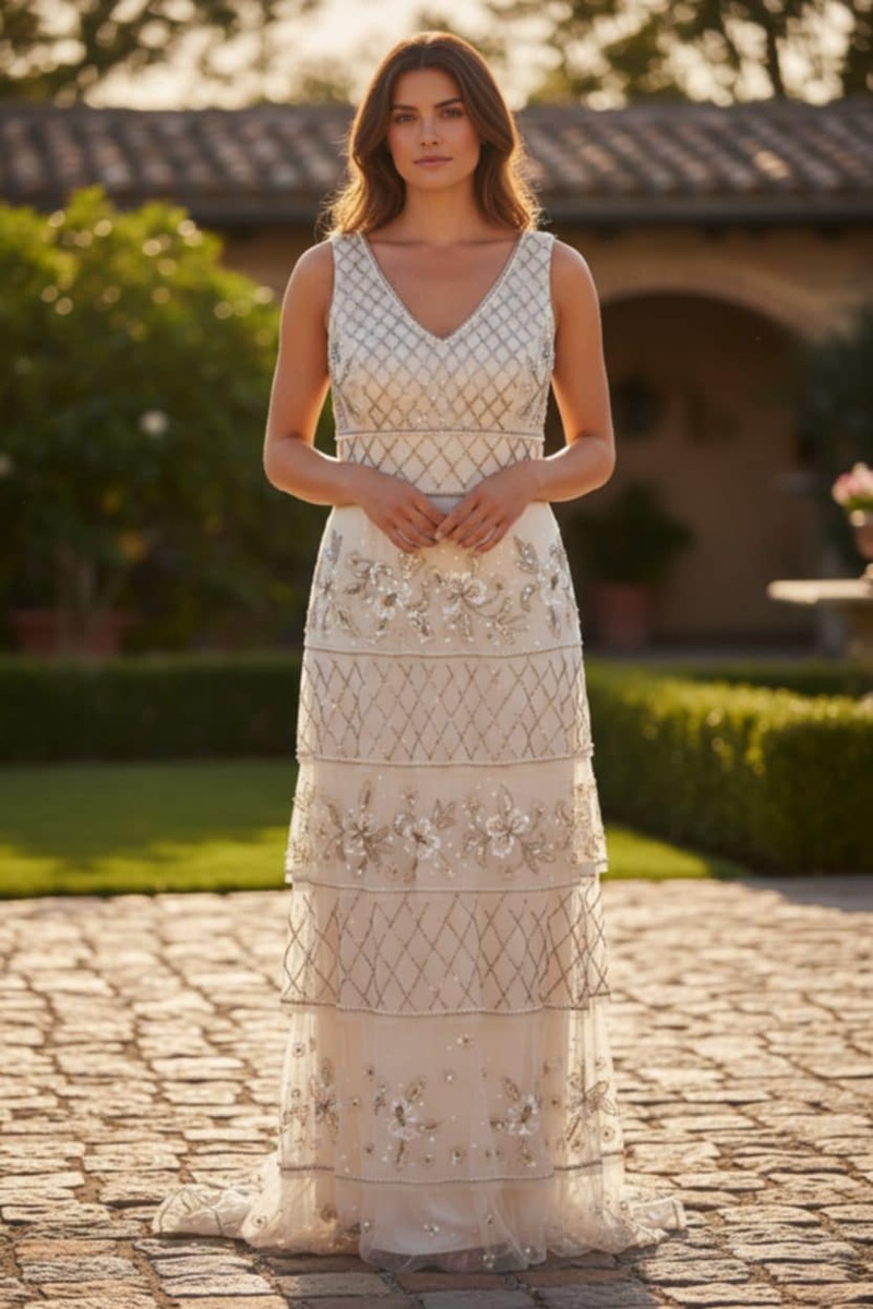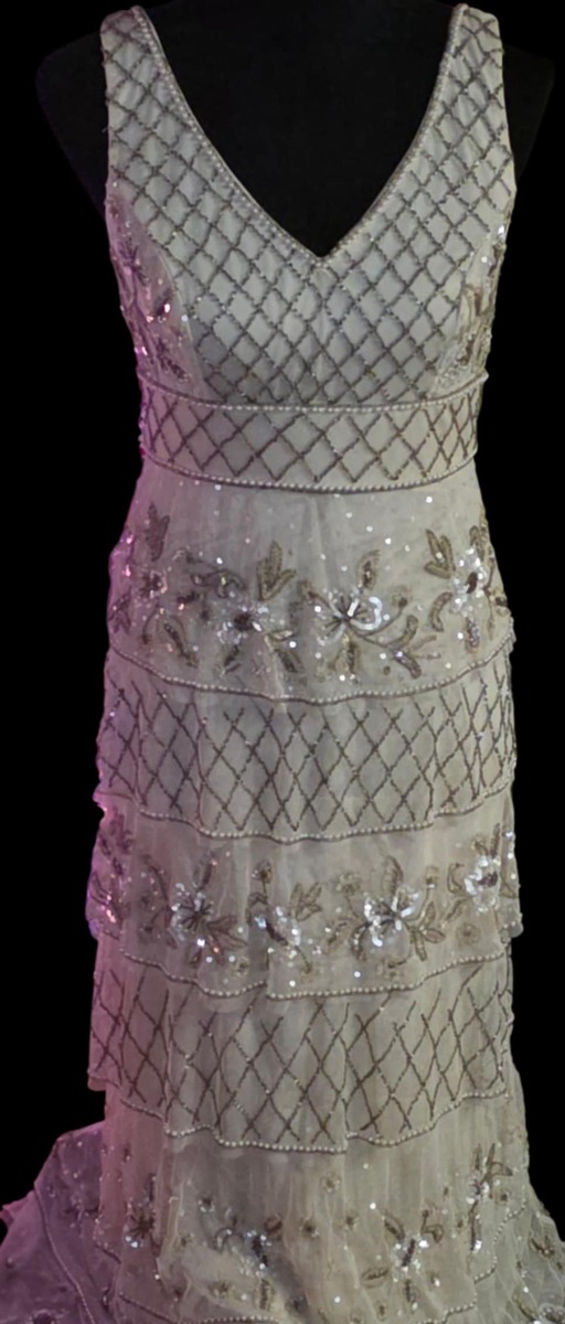 Style: Beaded tiered gown, often described with an Art Deco or Gatsby influence