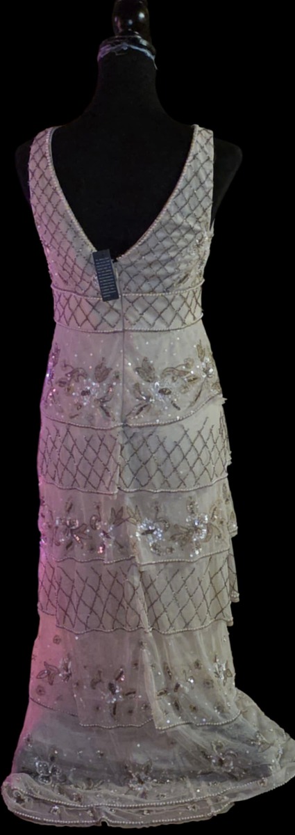 BNWT......This dress is the Adrianna Papell Beaded Tiered Gown. It is a long, sleeveless, V-neck dress featuring intricate art deco-inspired beading and sequin details with tiered layers.