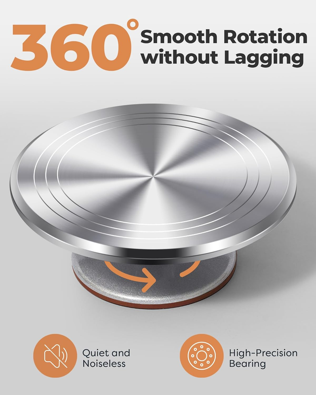 With concealed ball bearings built in, the cake spinner effortlessly rotates 360, allowing easy access to your cake from all sides quietly