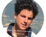 Approximate measurements: 2" in diam. The sticker reads " Saint Carlo, Patron of the internet, pray for me"