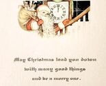 C1940s Christmas Greeting Card Used Santa Claus Toy Bag Grandfather Clock E85G