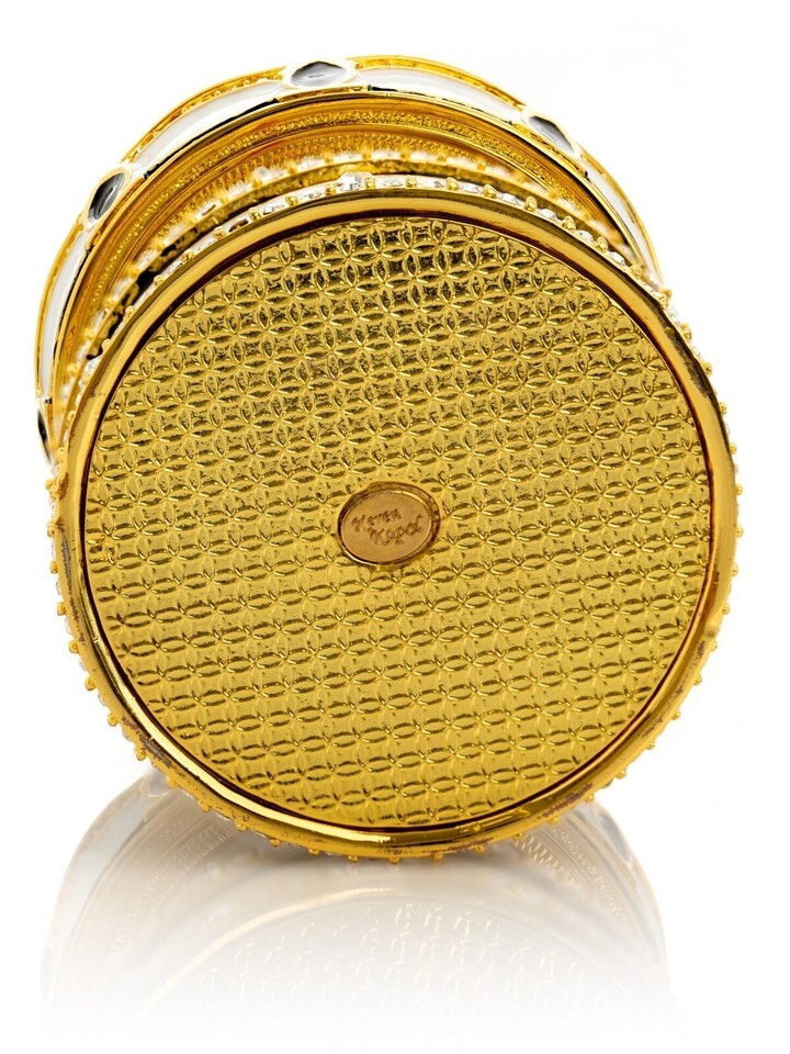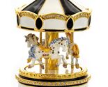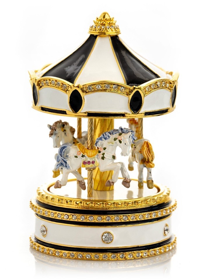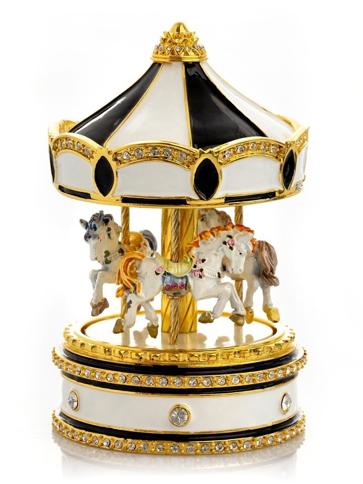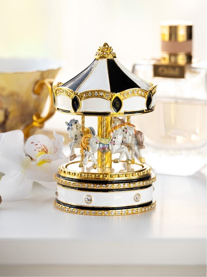 Cette exquise boîte a bibelots Keren Kopal est une veritable ?uvre d'art. Son motif en email noir et metal dore est orne de details complexes et de cristaux autrichiens etincelants. La boîte a bibelots a la forme d'un carrousel avec des chevaux, et elle joue la belle melodie de "Chateau dans le ciel". Cette boîte a bibelots de collection est parfaite pour toutes les occasions et ferait un merveilleux ajout a toute collection. Il mesure 7,1 x 7,1 x 11,1 cm et est fabrique a la main avec soin. L'article est livre dans une boîte a conserver et est une piece originale fabriquee en Israel.