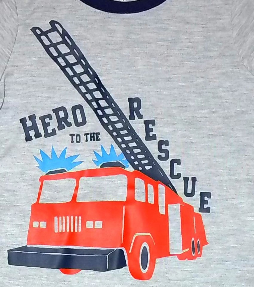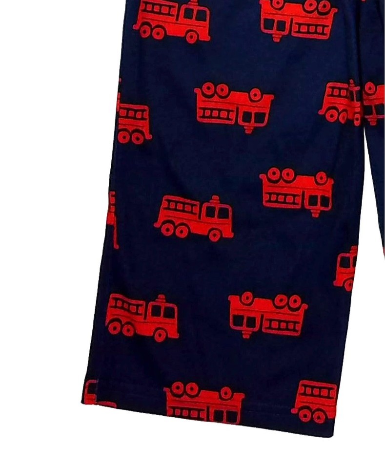 A super cute 'Hero to the Rescue' themed applique in fabric and embroidery. Navy blue crew neck style collar and long sleeves. Navy blue pajama pants with a Firetruck print throughout. An elasticized waistband lends for a custom fit. Crafted of a comfy and roomy polyester jersey.