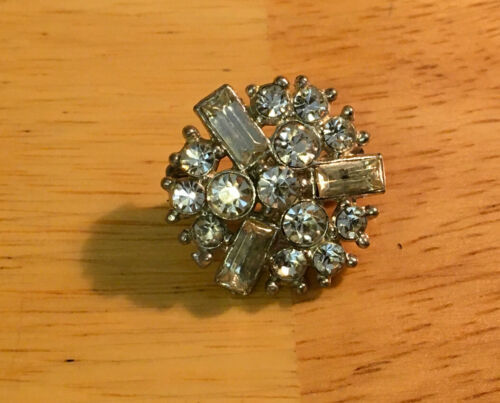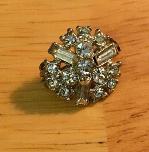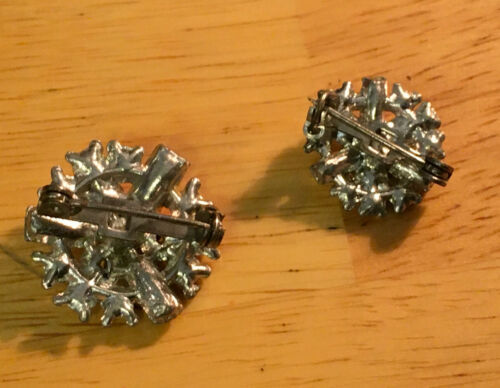 Clear Rhinestone Pins Matching. Preowned in good condition. Circular, one is slightly larger. Big one is 3/4 inch in diameter, the smaller 5/8 inch. No markings. Feel free to email with questions. I do combine shipping on multiple purchases. Have a great day!