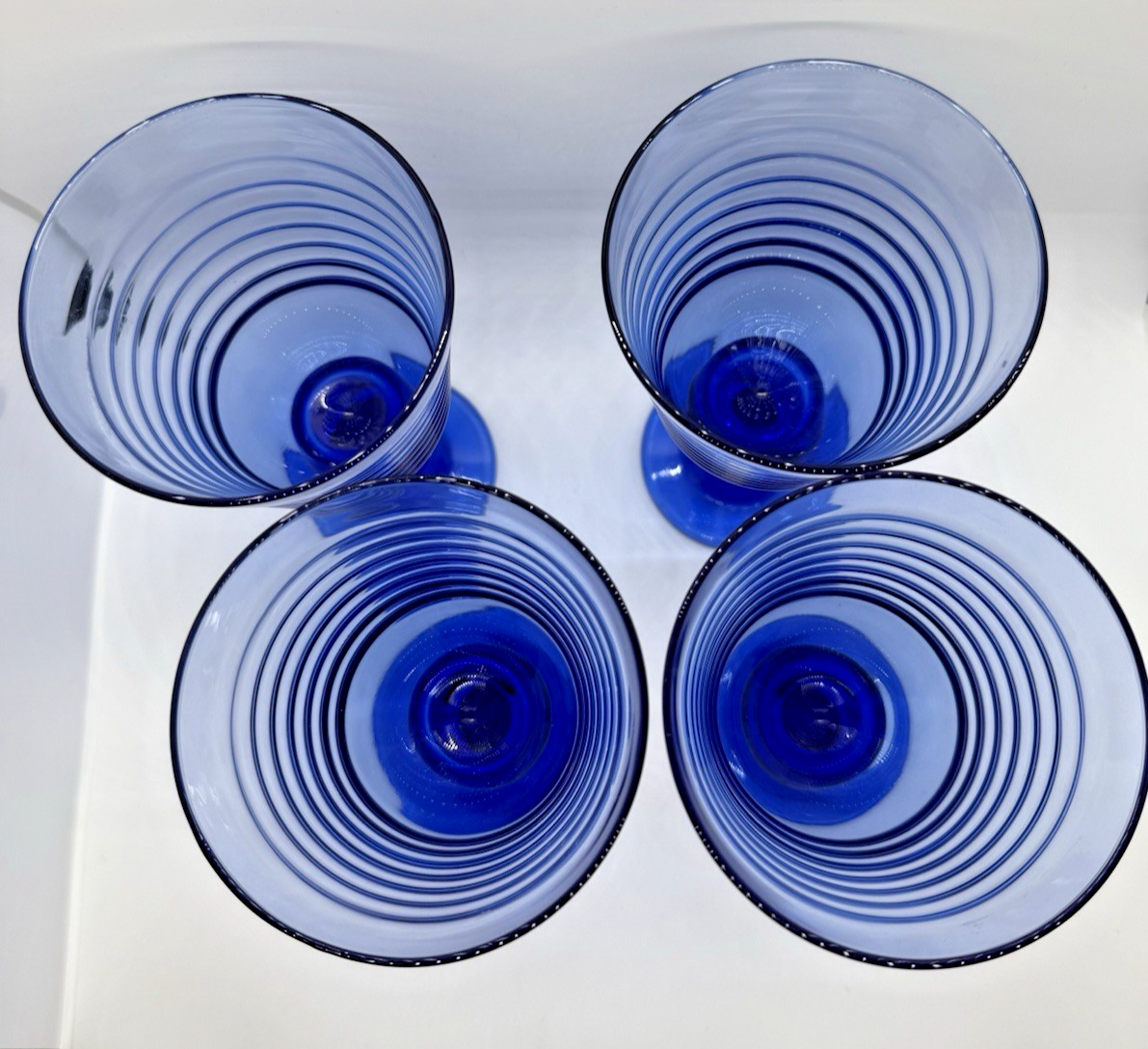 Beautiful set of four vintage Libbey cobalt blue water goblets featuring a ribbed bowl, sturdy pedestal stem, and the classic script L maker?s mark on the base. The deep, rich cobalt blue adds bold color to any table setting?perfect for everyday use, display, or coastal/MCM decor.
