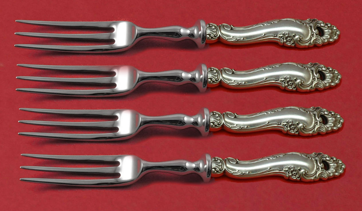 Sterling silver hollow handle with stainless implement 4-piece individual Fruit Fork Set, 6" custom made in the pattern Decor by Gorham. It is not monogrammed and is in excellent condition.