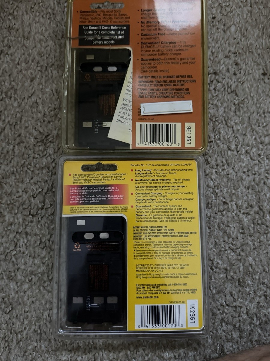 Lot of two Duracell DR10 camcorder rechargeable batteries. Both come in their original packaging, but neither is sealed. Batteries are untested.