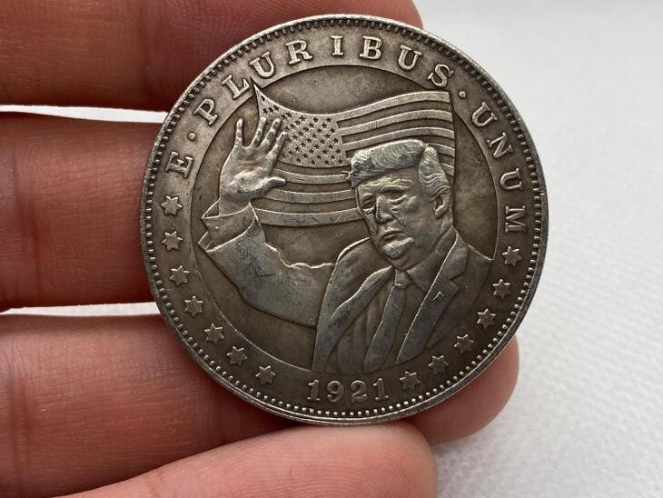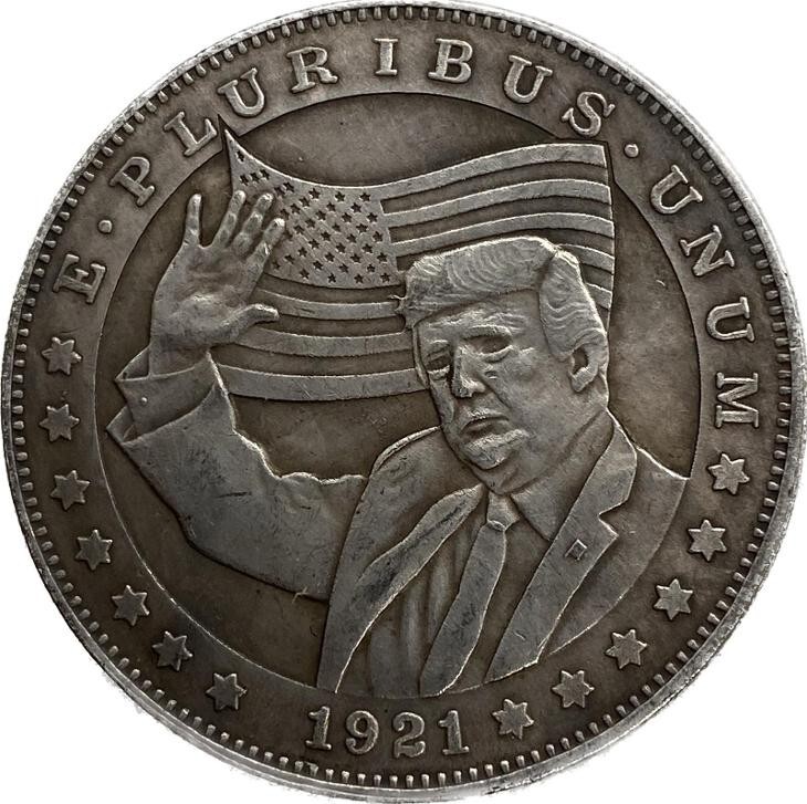 This unique coin featuring the portrait of Donald Trump is inspired by the classic design of the American dollar from 1921, embodying a modern collectible artifact rich in symbolism. The obverse side showcases a detailed depiction of Trump against the backdrop of the American flag, reflecting his influential role in the political landscape of the United States. The inscription ?E PLURIBUS UNUM? (Out of many, one) underscores the ideals of national unity and integration.The reverse of the coin preserves the traditional motif of the United States eagle, clutching an olive branch and arrows, symbolizing peace and strength. While this coin is not silver, its design remains true to the historical style of American dollars, offering an attractive collectible piece with a contemporary political theme. This coin is a modern minting that bridges the iconography of the past with the personality of a recent political figure, making it a compelling addition for collectors and enthusiasts alike.