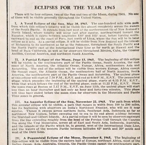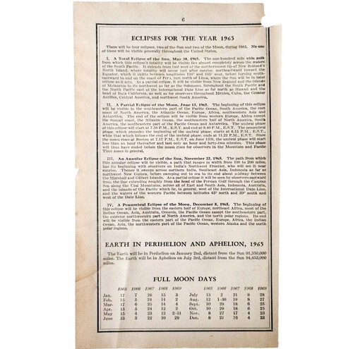 Eclipses Schedule And Full Moon Days 1965 Almanac Astronomy Ephemera DWNN4
