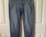 Keywords: Eddie Bauer, women's jeans, size 4, straight style, blue denim, medium wash, cotton, spandex, five-pocket, zip closure, machine washable, pre-owned, Bangladesh.