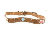 Vintage 1980s light brown stamped leather belt in a Western style with faux semi-precious stones by Elite of California. Buckle is silver and measures 1 oe? x 2?.