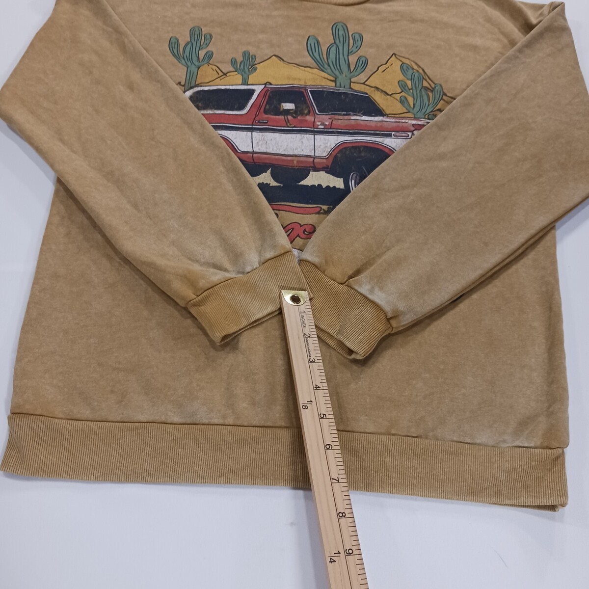 The Ford Bronco Little and Big Boys Mineral Washed Graphic Sweatshirt in size XXL (18) is a stylish and comfortable pullover sweatshirt perfect for young boys. Made with a solid tan color and featuring a graphic of a Ford Bronco, this sweatshirt is sure to be a hit with any young Ford enthusiast. With a chest size of 42 inches and long sleeves, this sweatshirt is designed for both style and comfort, making it a great addition to any young boy's wardrobe.