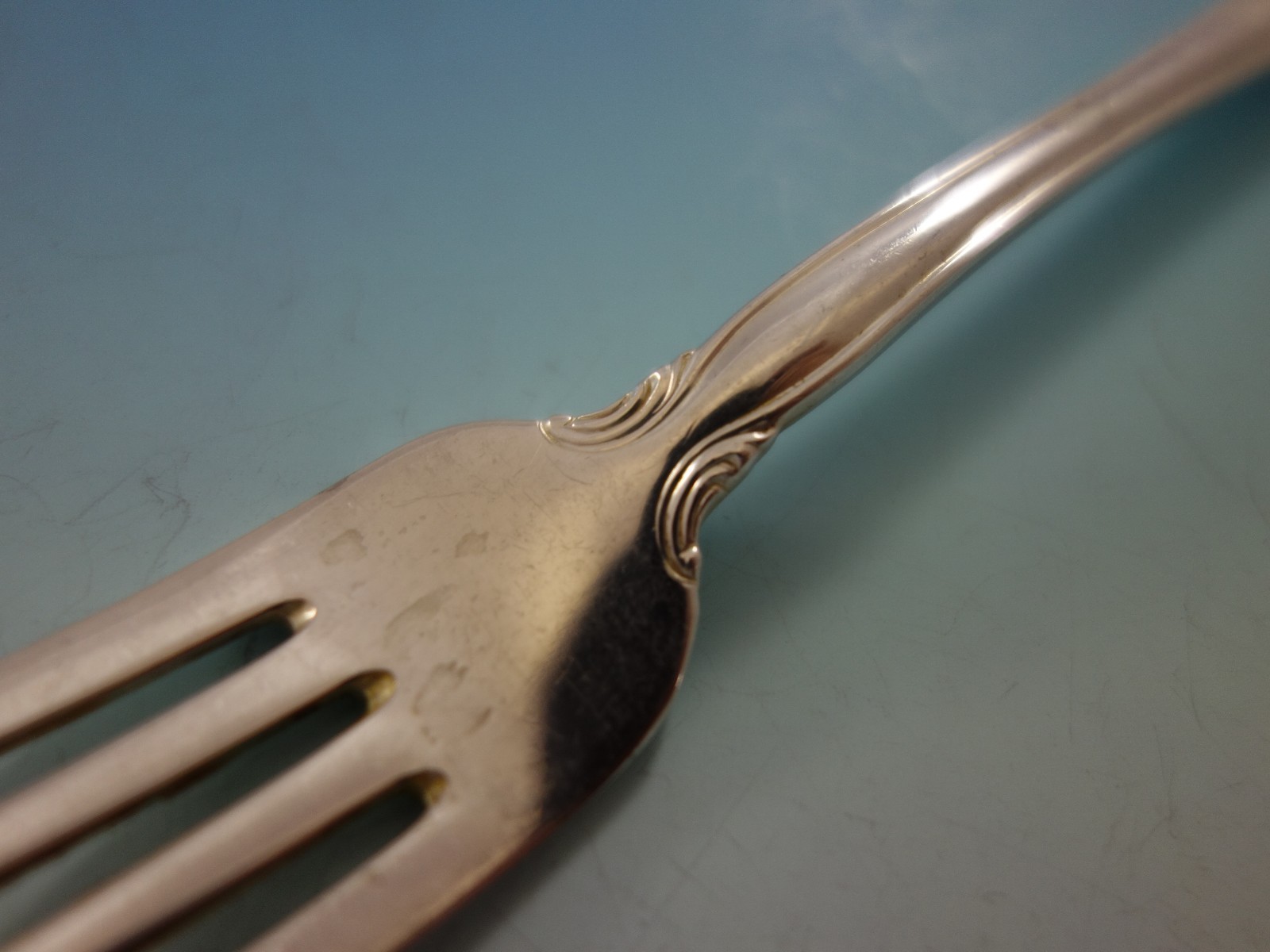 A blend of three design motifs gives this pattern a distinctive feeling of richness tempered with informal simplicity. Introduced in 1948, the traditional fiddle-shaped outline has beautifully proportioned curves with a narrow decorative border of curling leaves and scrolls to bring out the simplicity of the broad silver panel. This understated design lends itself to virtually any dcor and is suitable for both everyday dining and festive occasions.
