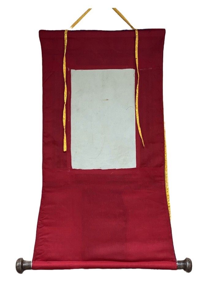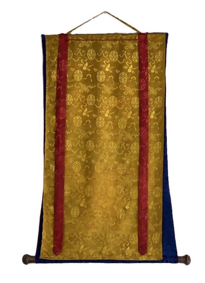 This is an original hand-painted Tibetan Thangka depicting Guru Rimpoche (Padmasambhava), bordered with a luxurious silk brocade. Padmasambhava is honored as the manifestation of Amitabha Buddha and is one of the most important figures in Vajrayana Buddhism. He is credited with bringing Tantric Buddhism to Tibet in the 8th century, shaping the spiritual foundation of the entire Himalayan region.
