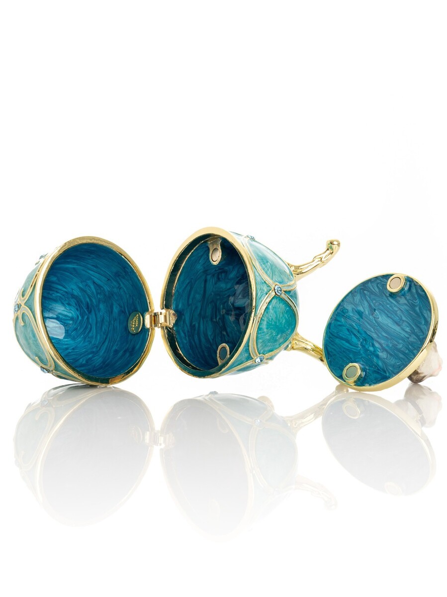 The Keren Kopal Egg with Cat Trinket box is a beautifully decorated collectible item adorned with Austrian crystals. This handmade trinket box features an Art Nouveau style with a gold plated finish and green enamel details, making it suitable for any room in the house. The unique egg shape, along with the addition of a cat design, adds a playful and artistic touch to this piece. With easy care instructions and a magnetic closure, this trinket box is a charming addition to any collection or as a gift for various occasions.
