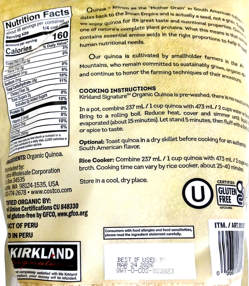 - Kirkland Signature Organic Quinoa Gluten Free 4.5 Lbs EXP 03/2026