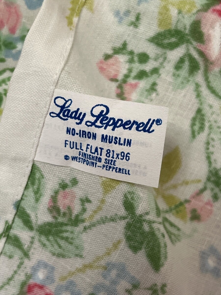 Beautiful vintage Lady Pepperell ?No-Iron Muslin? full-size sheet set featuring a charming pastel floral print in pink, green, yellow, and blue on a white background. The set includes one full flat sheet and one full fitted sheet. The flat sheet is accented with a delicate white ruffle and soft pink trim for an extra touch of cottage-style charm.