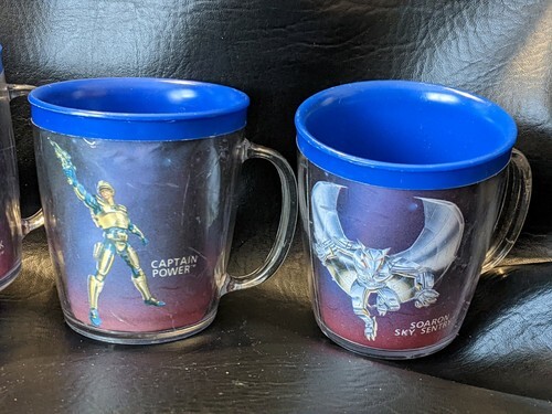 A vendre est un lot d'occasion de 4 1987 Captain Powers Plastic Blue Clear Cups Tug: Capitaine Power Seigneur Dread Major Hawk Materson Soaron Sky Sentry